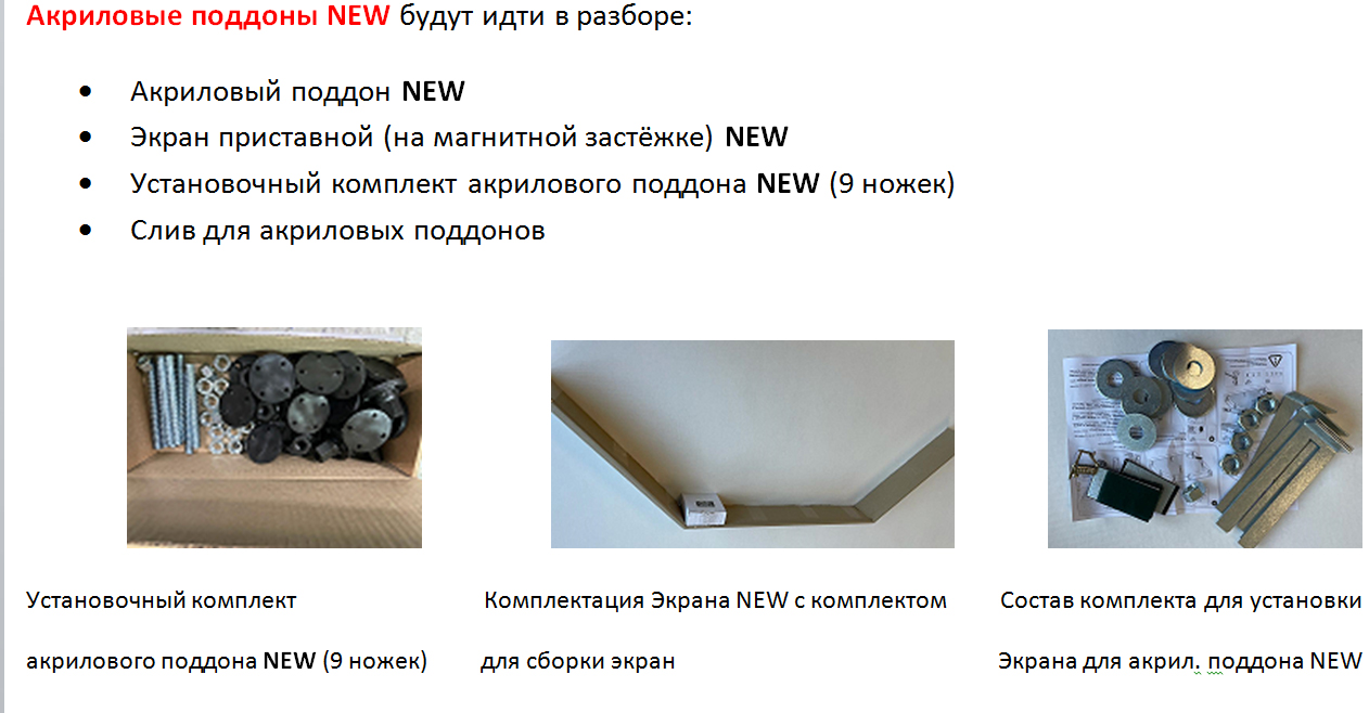 Экран приставной (на магнитной застёжке) NEW Установочный комплект акрилового поддона NEW (9 ножек) Слив для акриловых поддонов |