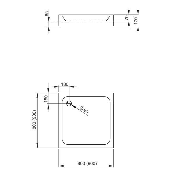 Квадратный, компактный, цельнолитой поддон на базе из пенопласта. Отверстие под сифон Ø90 мм.