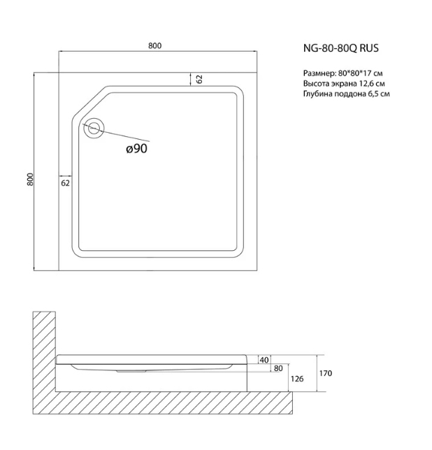 Квадратный душевой поддон Niagara NG-80-80Q RUS (80х80х17 см) 80801QRUS