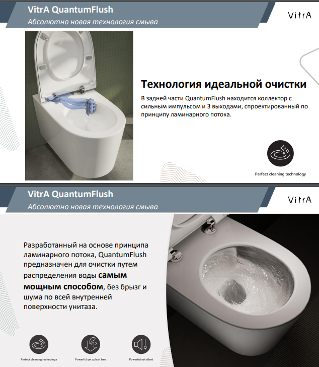 Благодаря использованию непористых материалов (фарфора и дюропласта) и глазуровке поверхности, унитазы не впитывают грязь и бактерии и сохраняют первоначальный цвет на протяжении всего срока службы. Поверхности, прилегающие к стене, тщательно отшлифованы, что обеспечивает идеальное примыкание к стене. За счет системы душевого смыва и специальной формы чаши достигается 100% очищение внутренней поверхности унитаза при экономном расходе воды. Подвесные унитазы VitrA проверяются на нагрузку в 600 кг, а сиденья тестируются на 50 000 открываний/закрываний, что гарантирует высокий уровень прочности. Петли и крепежи в сиденьях сделаны из нержавеющего металла. Благодаря специальному механизму крепления, крышка и сиденье снимаются быстро и просто, что значительно облегчает процесс уборки.