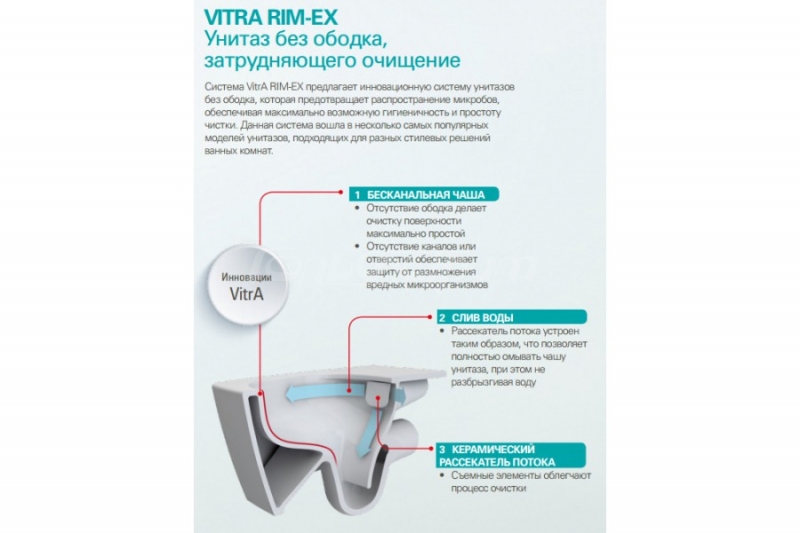 Компания VitrA разработала систему Rim-ex. Теперь у чаши полностью отсутствует обод, а вода при смыве подаётся под большим напором. Рассекатель потока устроен таким образом, что брызги не вылетают наружу. Внутренняя поверхность санитарной керамики омывается быстро и эффективно. Отсутствие ободка делает очистку унитаза максимально простой и обеспечивает защиту от размножения вредных микроорганизмов. Чаши Rim-ex избавляют от необходимости очищать налёт, грязь и ржавчину в труднодоступных местах.