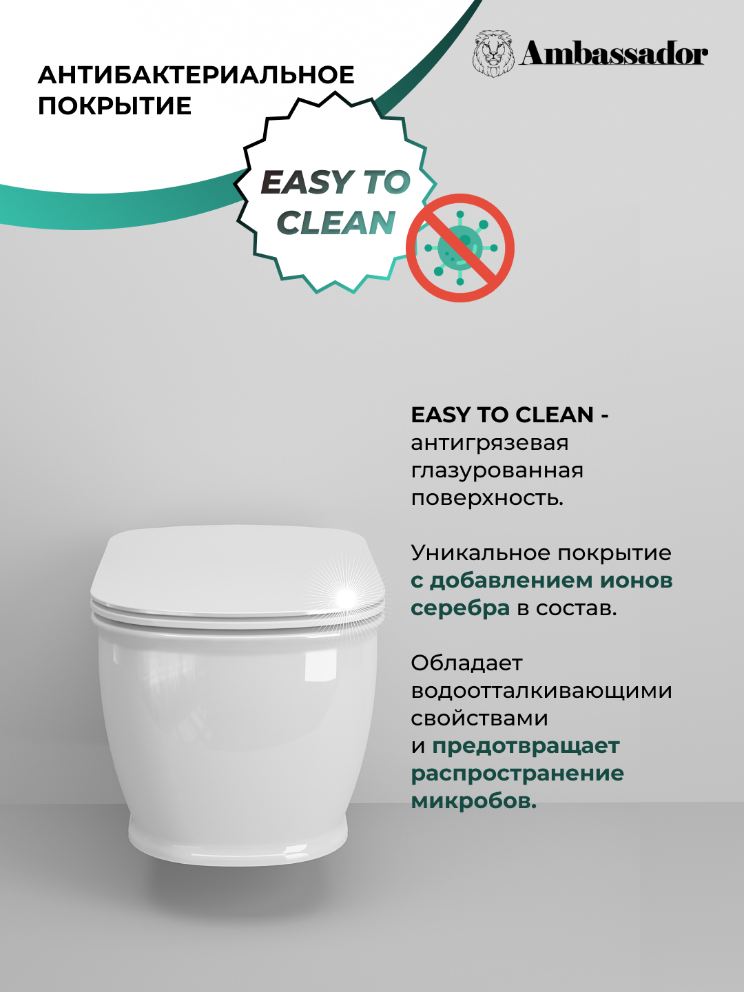 Поверхность унитаза имеет антигрязевое глазурованное покрытие Easy to clean, которое содержит ионы серебра. Это покрытие обладает водоотталкивающими свойствами и предотвращает рост микробов, облегчая процесс уборки и поддерживая высокий уровень гигиены в вашей ванной комнате.