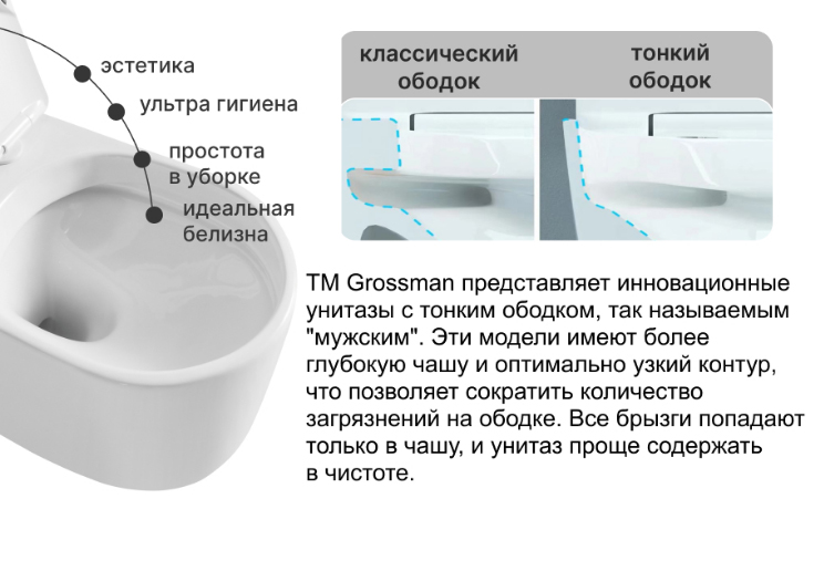Унитаз оснащен инновационным тонким ободком, так называемым "мужским", который не только придаёт изделию стильный вид, но и облегчает уход за ним. За счёт более глубокой чаши и узкого контура, все брызги попадают исключительно в чашу, что значительно сокращает загрязнения на ободке. Это делает модель практичной и удобной для ежедневного использования.