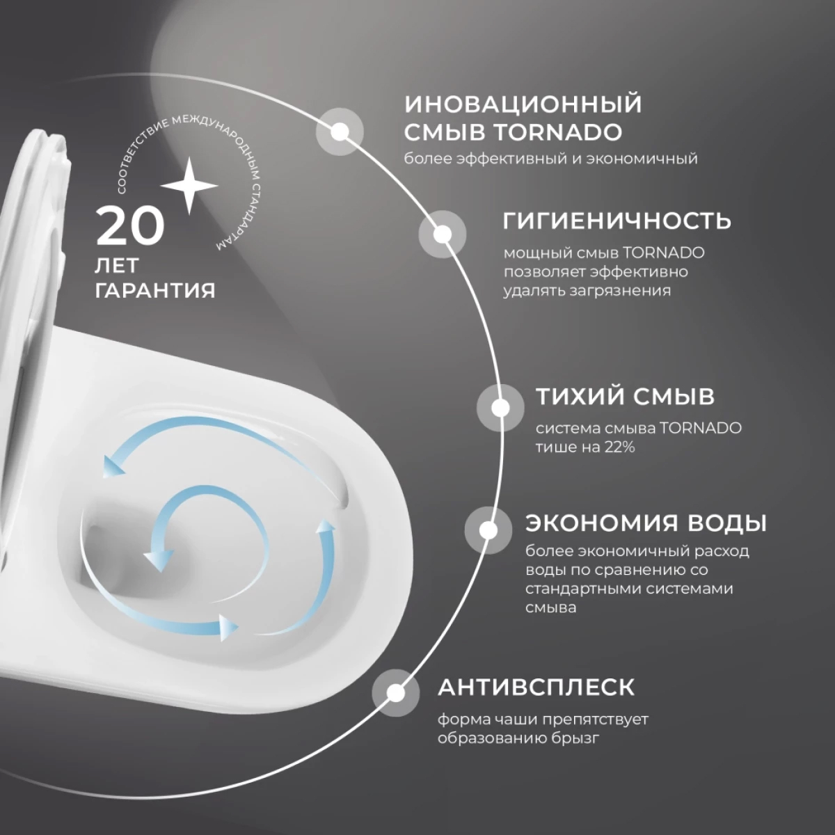 - Система смыва смыв торнадо на 20% эффективнее смыва обычных унитазов, при идентичном объеме слива воды, омывает чашу в 1.5 раза больше.