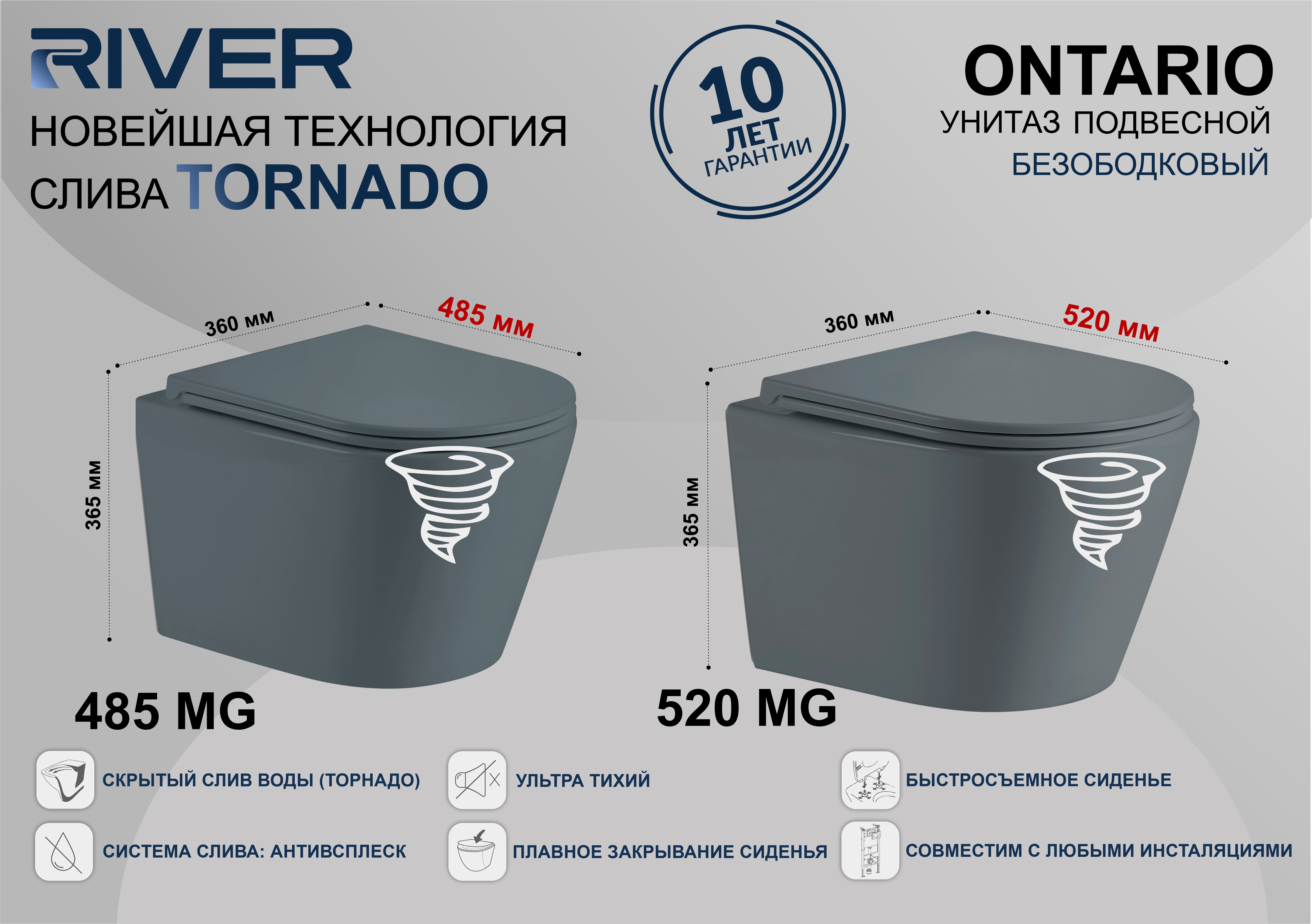Унитаз подвесной БЕЗОБОДКОВЫЙ River ONTARIO 520 MG смыв Торнадо серый матовый 10000013710