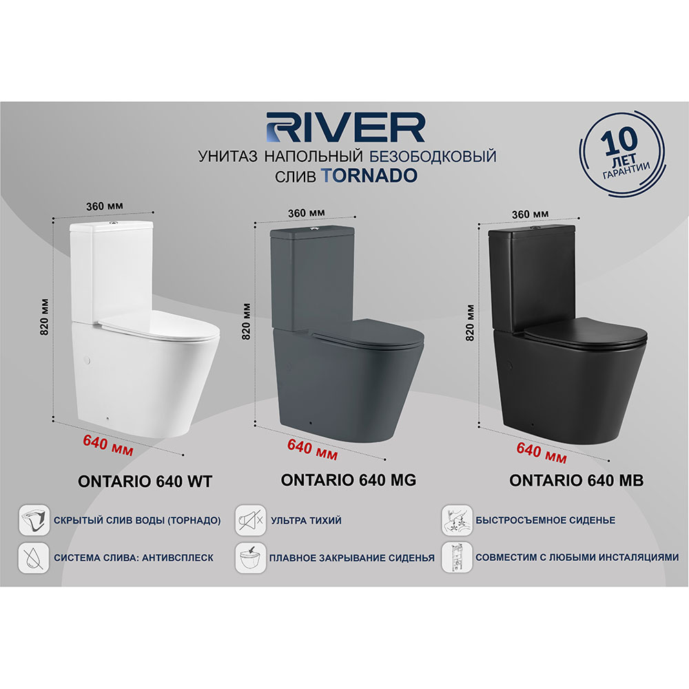 Унитаз подвесной БЕЗОБОДКОВЫЙ River ONTARIO 640 WT смыв Торнадо белый глянцевый 10000013711