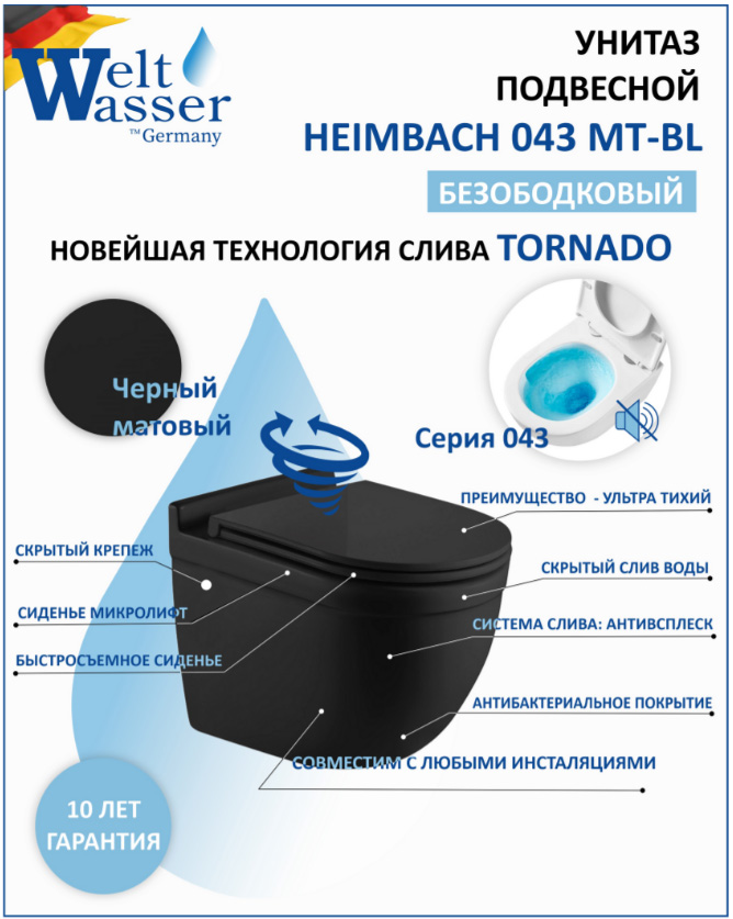 Унитаз подвесной БЕЗОБОДКОВЫЙ WeltWasser Heimbach 043 MT-BL (TORNADO) черный матовый 10000012078