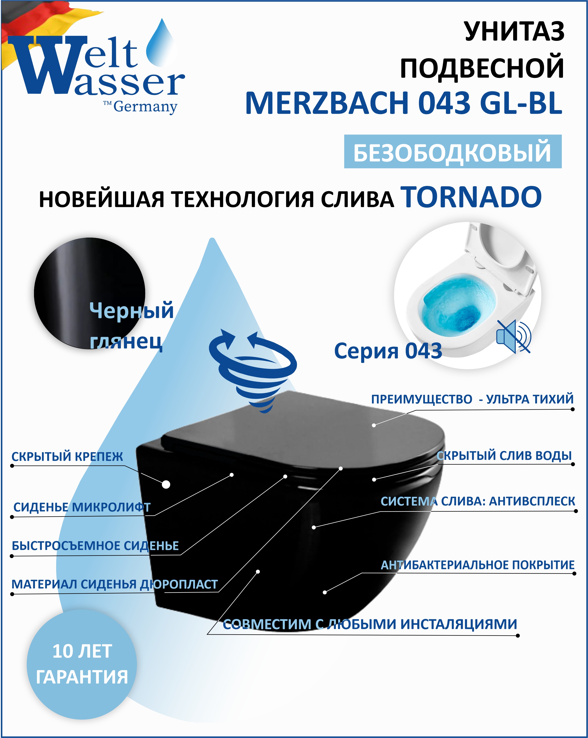 Унитаз подвесной БЕЗОБОДКОВЫЙ WeltWasser Merzbach 043 GL-BL (TORNADO) черный глянцевый 10000011164