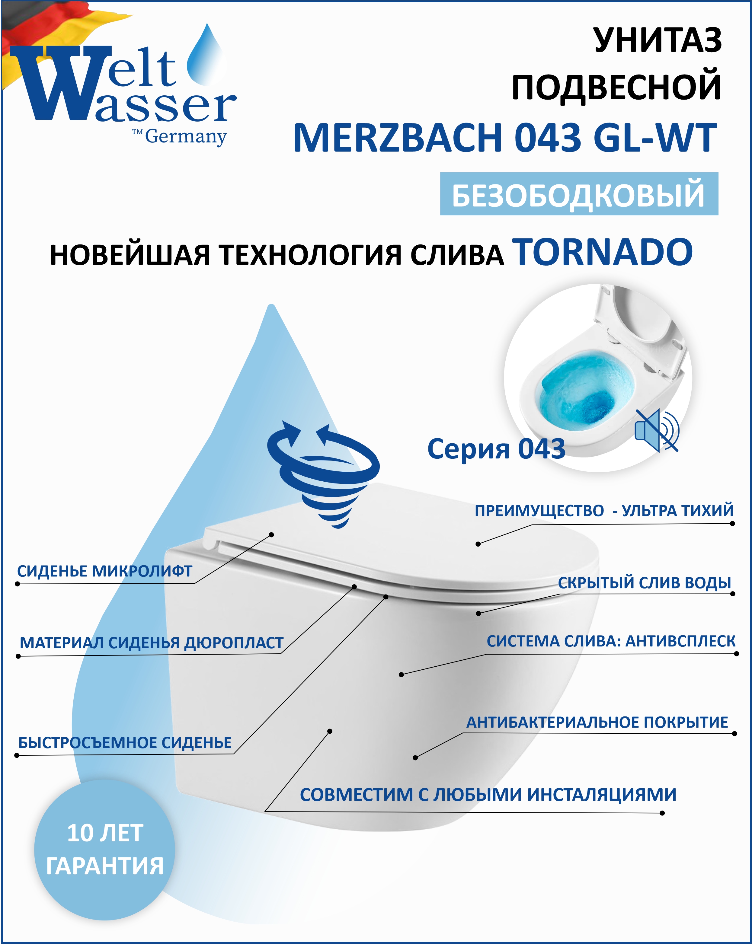 Унитаз подвесной БЕЗОБОДКОВЫЙ WeltWasser Merzbach 043 GL-WT (TORNADO) белый глянец 10000009939