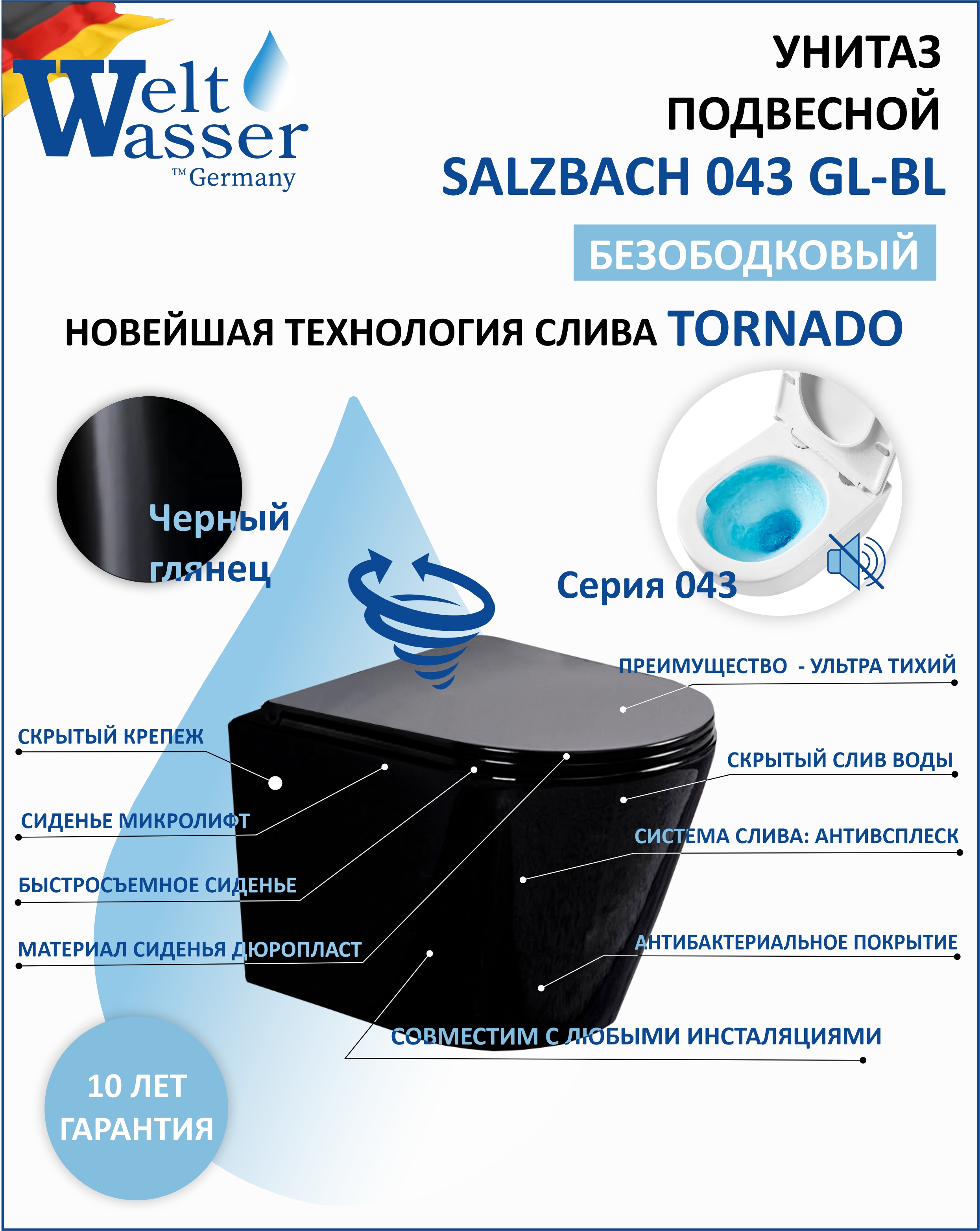 Унитаз подвесной БЕЗОБОДКОВЫЙ WeltWasser Salzbach 043 GL-BL (TORNADO) черный глянцевый 10000011696