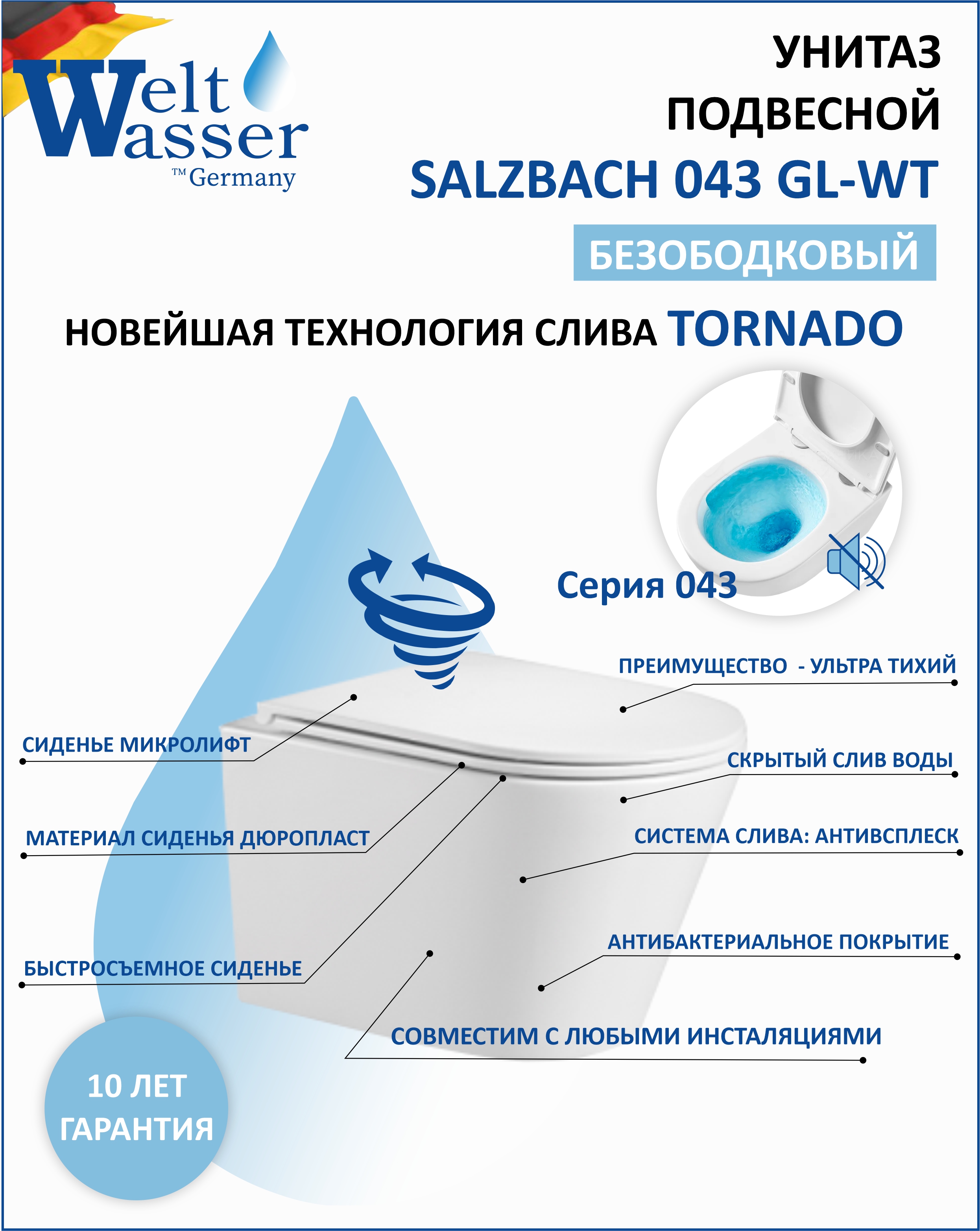 Унитаз подвесной БЕЗОБОДКОВЫЙ WeltWasser Salzbach 043 GL-WT (TORNADO) белый глянцевый 10000010281