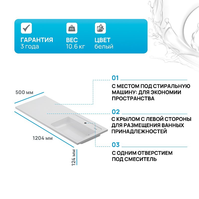 | Особенности | С бортиком, скрытым сливом, съемной мыльницей |