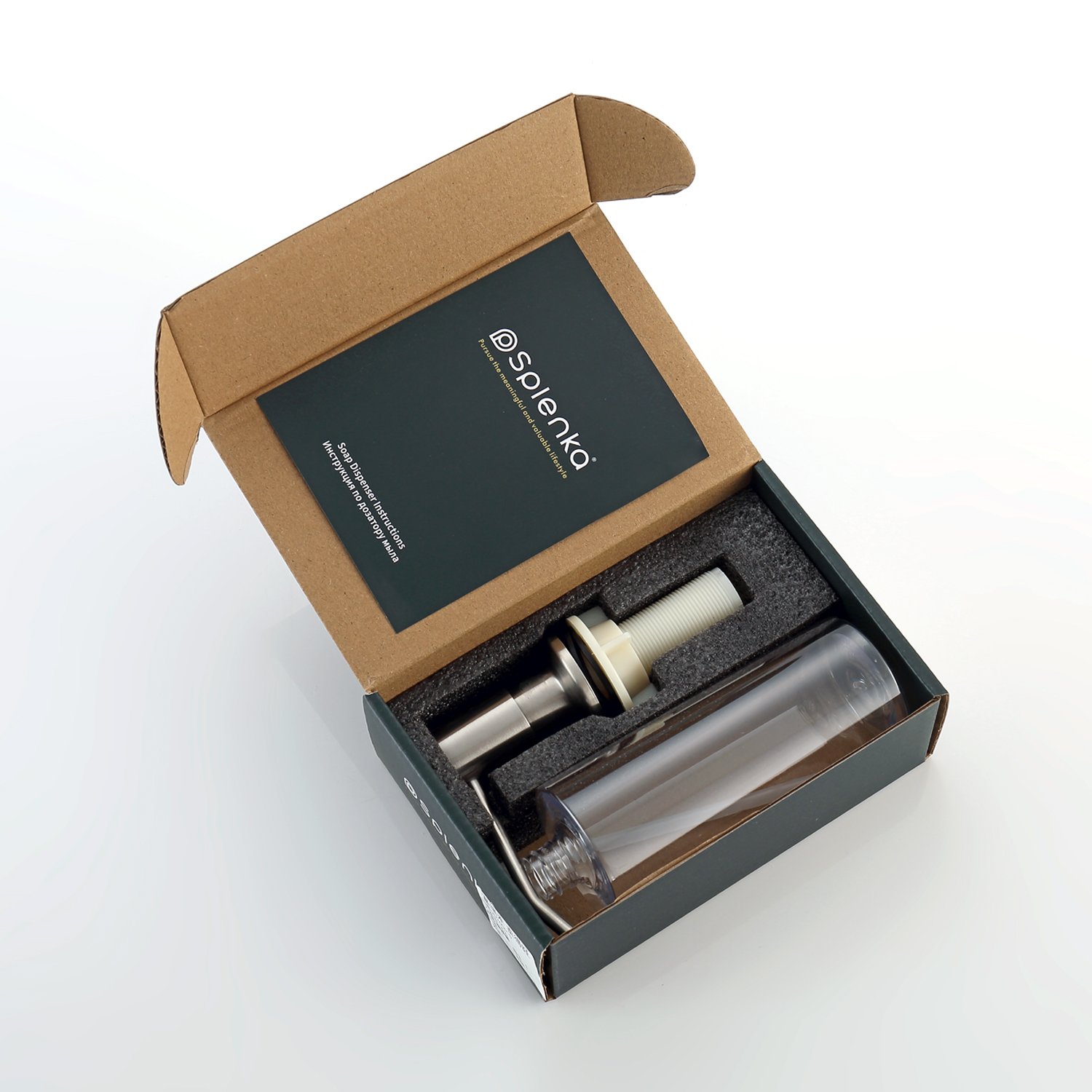 Комплектация: Дозатор с нажимным механизмом, ёмкость для моющего средства, инструкция по установке, гарантийный талон