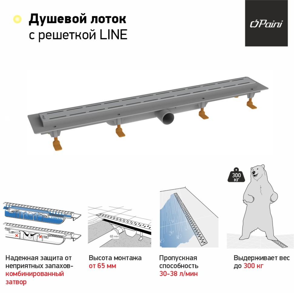 Пропускная способность от 30 до 37 л/мин в лотках "ПАИНИ" не позволит воде задерживаться в душевой.