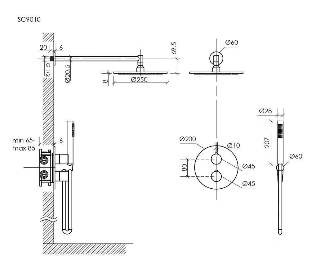 - Верхний душ из нержавеющей стали , Ø250 мм, с возможностью регулировки угла наклона
