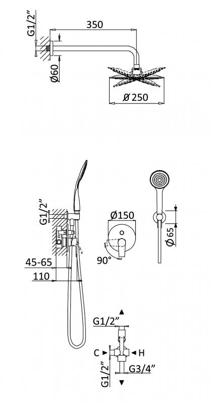 | Ручной душ, см | Лейка/ штуцер/ держатель/ шланг |