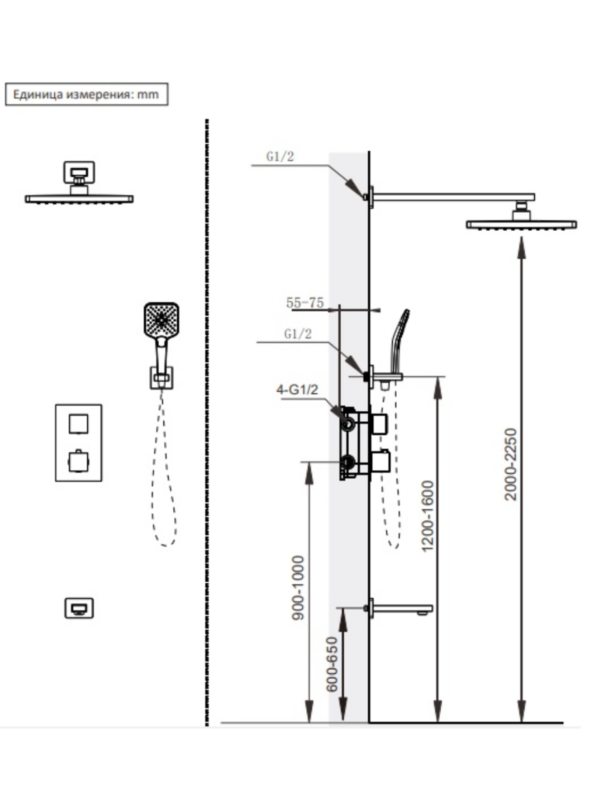 | В комплекте | Встраиваемая часть, термостат, штуцер/держатель душа, ручной душ, шланг, верхний душ, излив, аэратор |