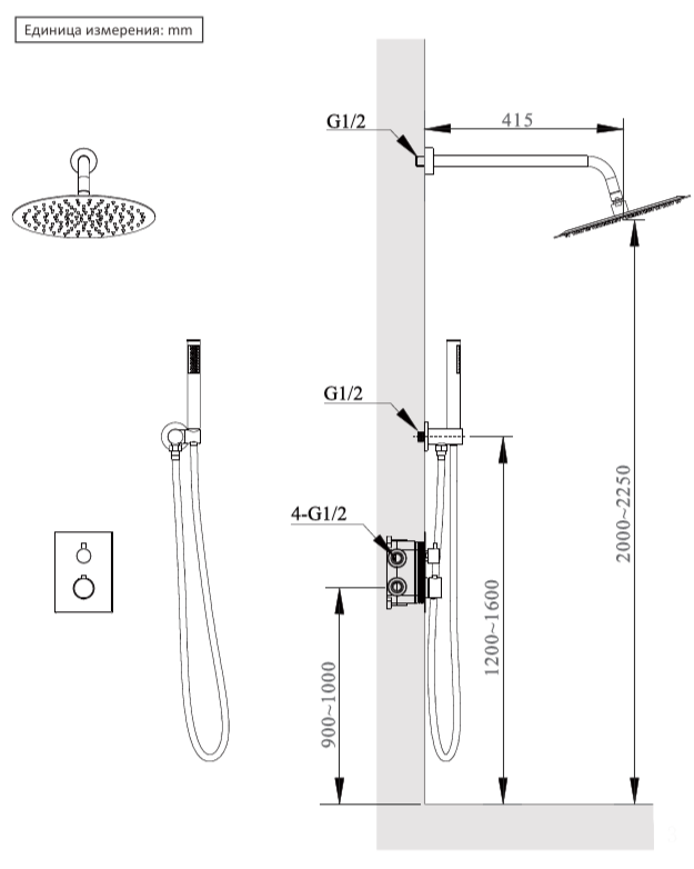 | В комплекте | Встраиваемая часть, термостат, штуцер/держатель ручного душа, ручной душ, шланг, верхний душ, кронштейн |