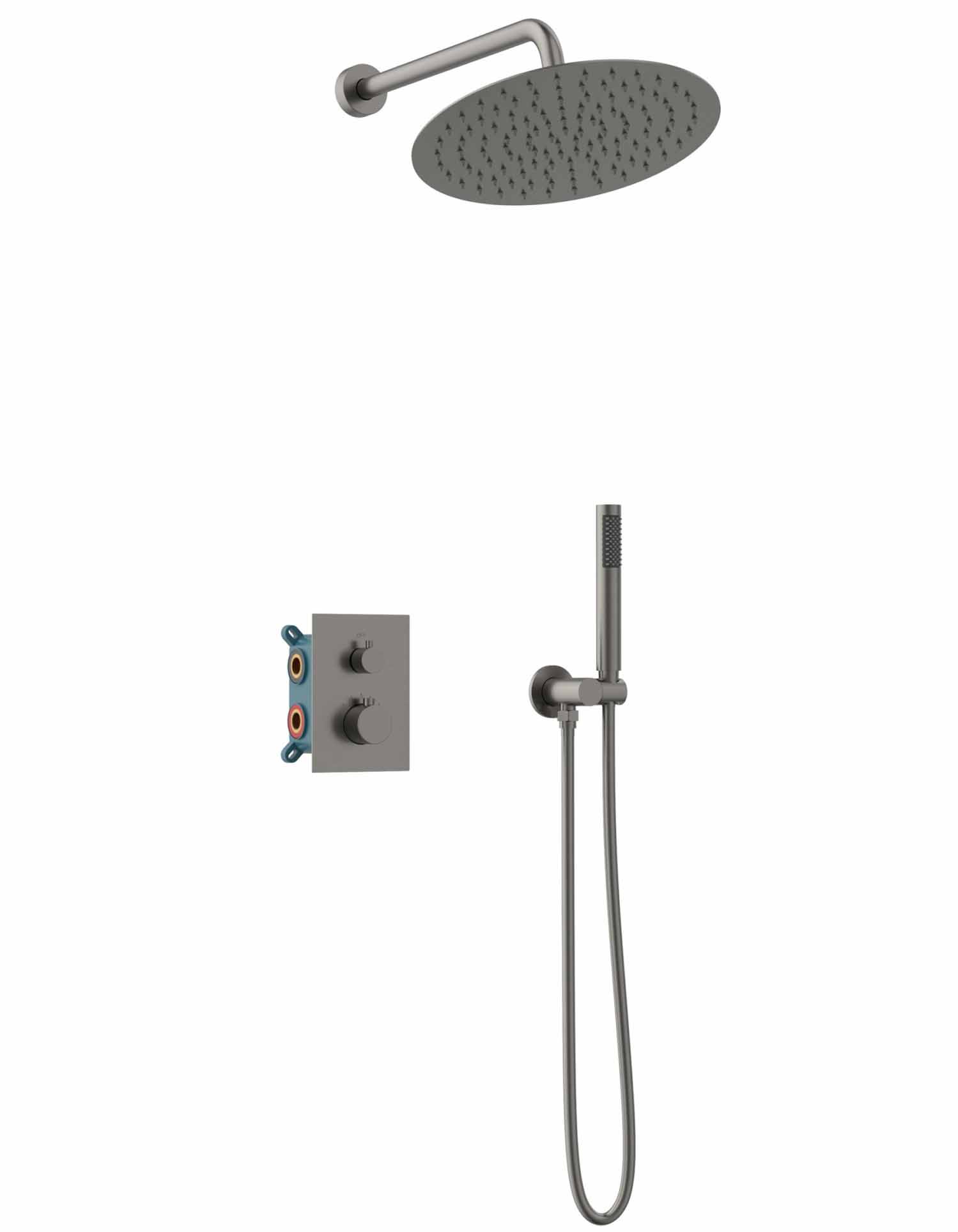 | В комплекте | Встраиваемая часть, термостат, штуцер/держатель ручного душа, ручной душ, шланг, верхний душ, кронштейн |