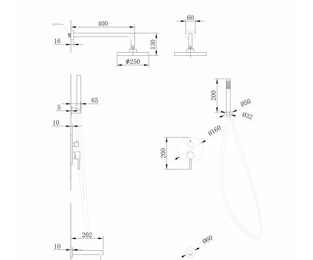 | В комплекте | Верхний душ, лейка с держателем, смеситель, излив |