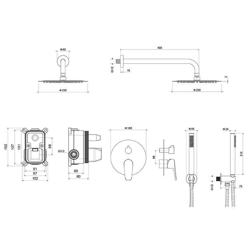 | В комплекте | Смеситель, верхний душ, душевой гарнитур |