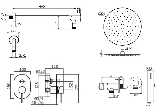 - SAT3130NO Настенное крепление верхнего душа 400мм из нержавеющей стали, черный матовый, Plumberia Selection