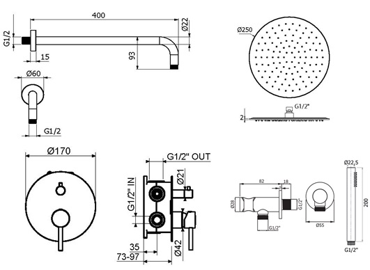 - SAT3174CR Верхний душ d. 250 из нержавеющей стали, встроенный клапан безопасности, поворотное крепление, антикальций, 2мм, хром, Plumberia Selection