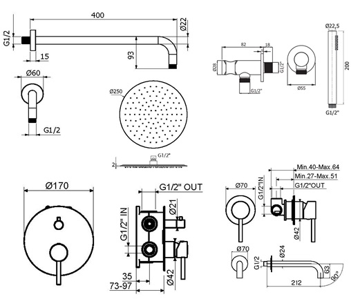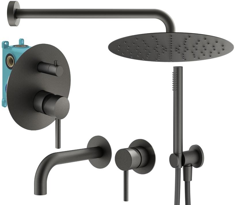 - KIT1901GR Комплект встраиваемого смесителя для душа с внутренней частью INT9036 на 2-3 выхода, накладка d. 170mm нержавеющая сталь, механический девиатор, графит IXO, Plumberia Selection