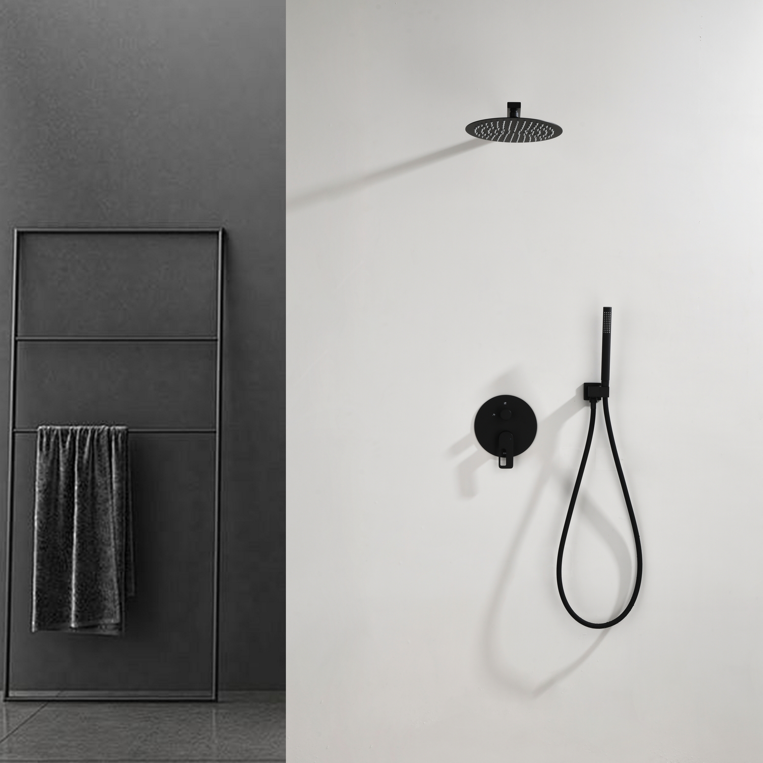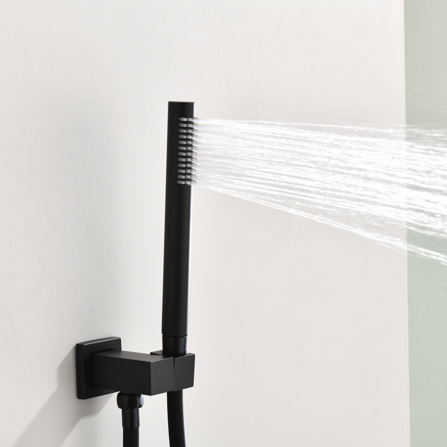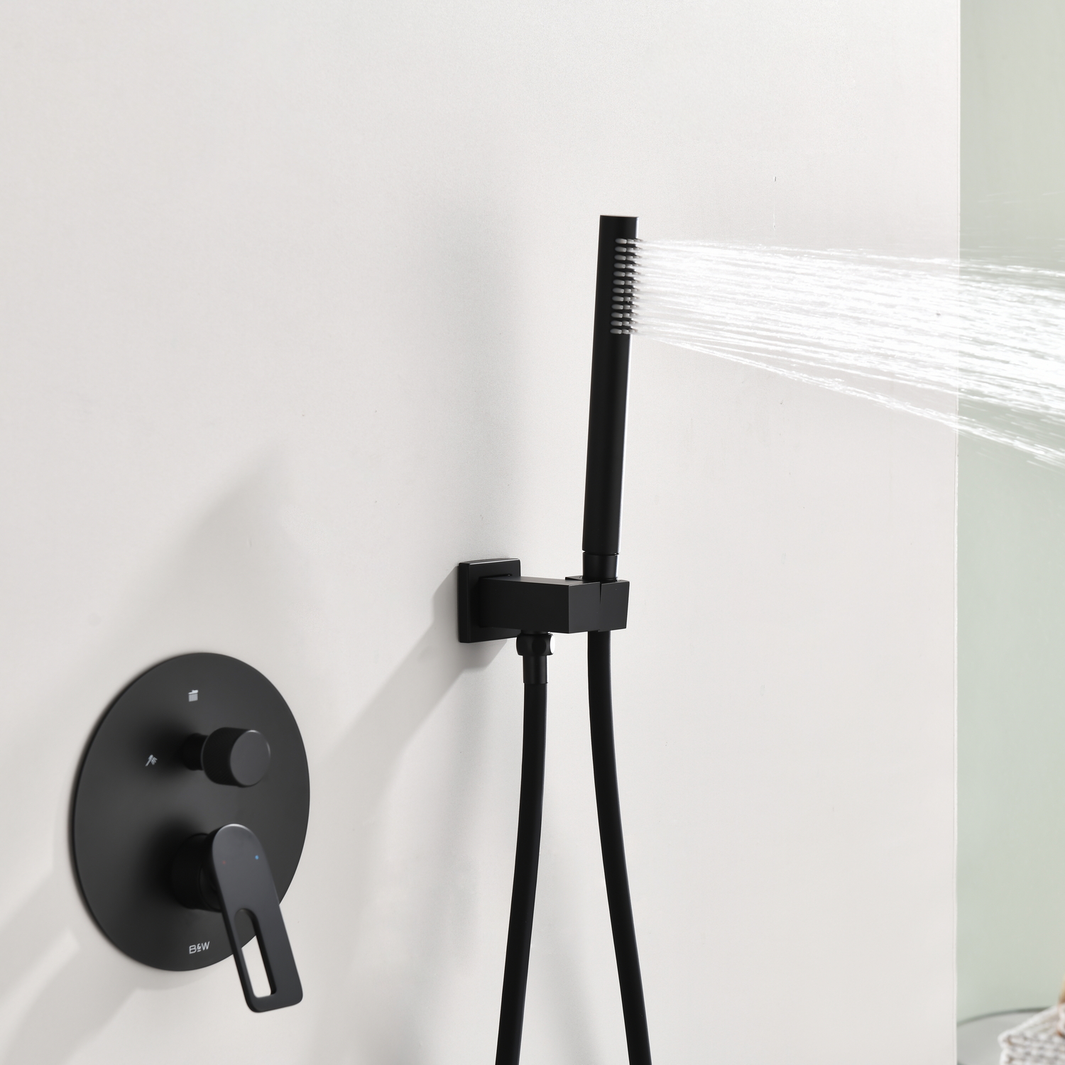 Душевая система скрытого монтажа Black&White в цвете черный матовый – минимализм и функциональность в одном изделии для Вашей новой ванной комнаты. Элементы продукта за исключением леек изготовлены из сантехнической латуни – ресурсного и безопасного для здоровья сплава, а ручной душ и верхняя лейка – из армированного ABS пластика. Для включения и настройки температуры воды установлен керамический картридж и поворотный дивертор. Данное решение позволит сэкономить свободное пространство внутри душевой зоны и сократит количество поверхностей для уборки, а пересечение в концепции дизайна круглых и квадратных форм наполнит Вашу душевую зону уютом и стилем.