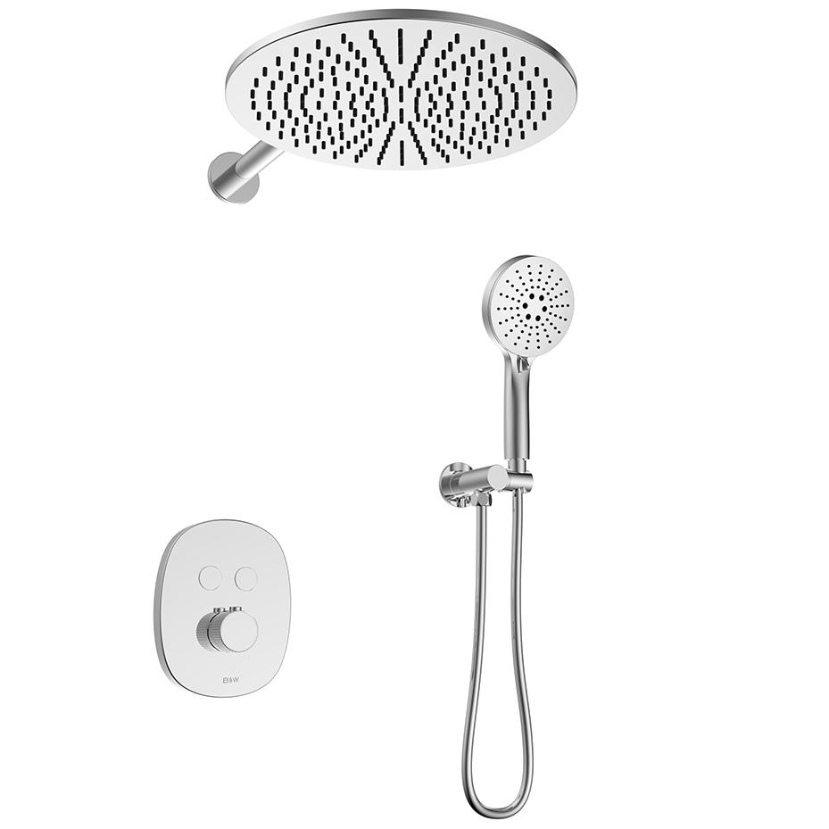 Комплект встраиваемого смесителя для душа Black&White – функциональное решение для Вашей новой ванной комнаты. Корпус блока управления и смесителя выполнен в форме овала, для подачи воды и настройки температуры используется термостатический смеситель без регулировки давления. А для выбора нужного режима установлены две круглые кнопки с пиктограммами. Из потребителей доступен ручной душ с переключателями режимов и верхняя лейка на круглом кронштейне. Плавные формы корпуса смесителя и круглые лейки гармонично выпишутся в классические и минималистичные интерьеры.