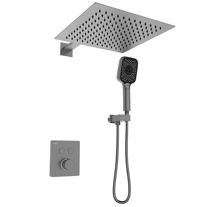 Готовое решение для душевой зоны скрытого монтажа Black&White - стильное решение для Вашей новой душевой зоны в ванной комнате. За управление давлением и температурой воды отвечает теромостатический смеситель постоянного потока, а для выбора режимов работы установлены две кнопки цилиндрической формы, расположенные в квадратном корпусе смесителя. Из потребителей доступен ручной душ с режимами, а также квадратная верхняя лейка на прямоугольном кронштейне. В дизайне изделия пересекаются квадратные и цилиндрические формы, которые гармонируют между собой создавая минималистичный облик, подходящий для большинства современных интерьеров.