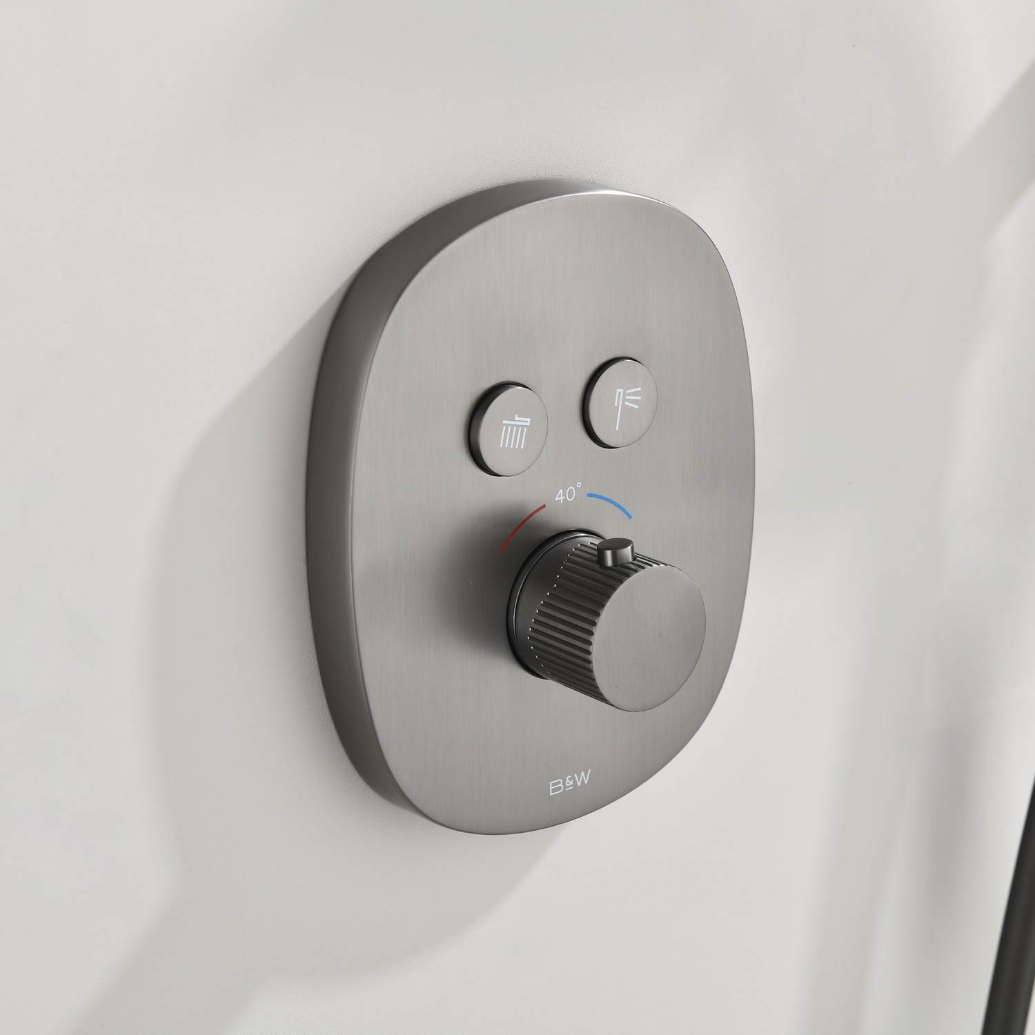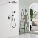 Комплект встраиваемого смесителя для душа Black&White – функциональное решение для Вашей новой ванной комнаты. Корпус блока управления и смесителя выполнен в форме овала, для подачи воды и настройки температуры используется термостатический смеситель без регулировки давления. А для выбора нужного режима установлены две круглые кнопки с пиктограммами. Из потребителей доступен ручной душ с переключателями режимов и верхняя лейка на круглом кронштейне. Плавные формы корпуса смесителя и круглые лейки гармонично выпишутся в классические и минималистичные интерьеры.