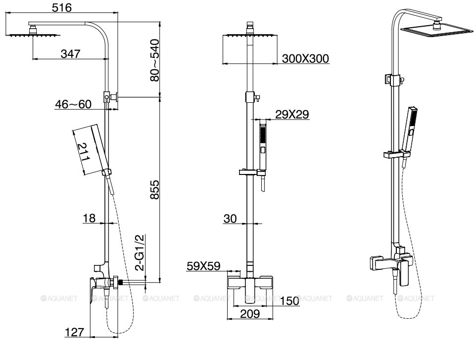 | В комплекте | Стойка, смеситель, верхний, ручной душ, шланг, держатель |