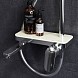 Смеситель выполнен в виде полочки. Чистый дизайн без лишних деталей: переключатель расположен за ручкой настройки температуры и позволяет менять источник потока воды от ручной лейки и излива до верхнего душа