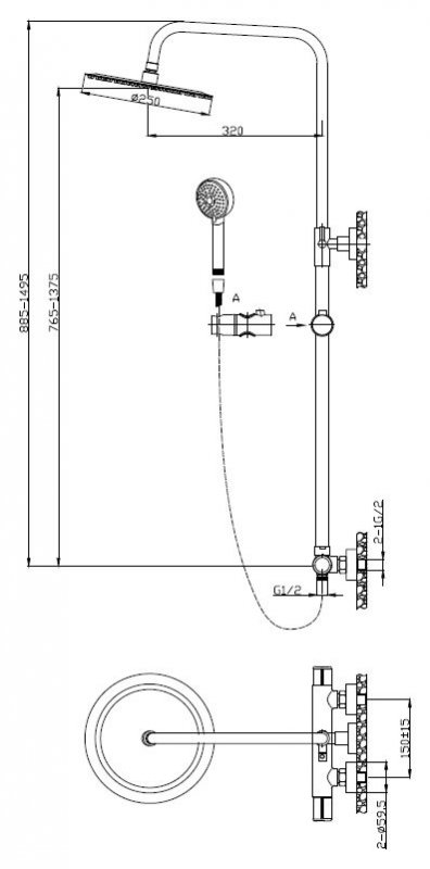 Оснащение: эксцентрики, дивертор, душевой шланг, душевая лейка, верхний душ, смеситель