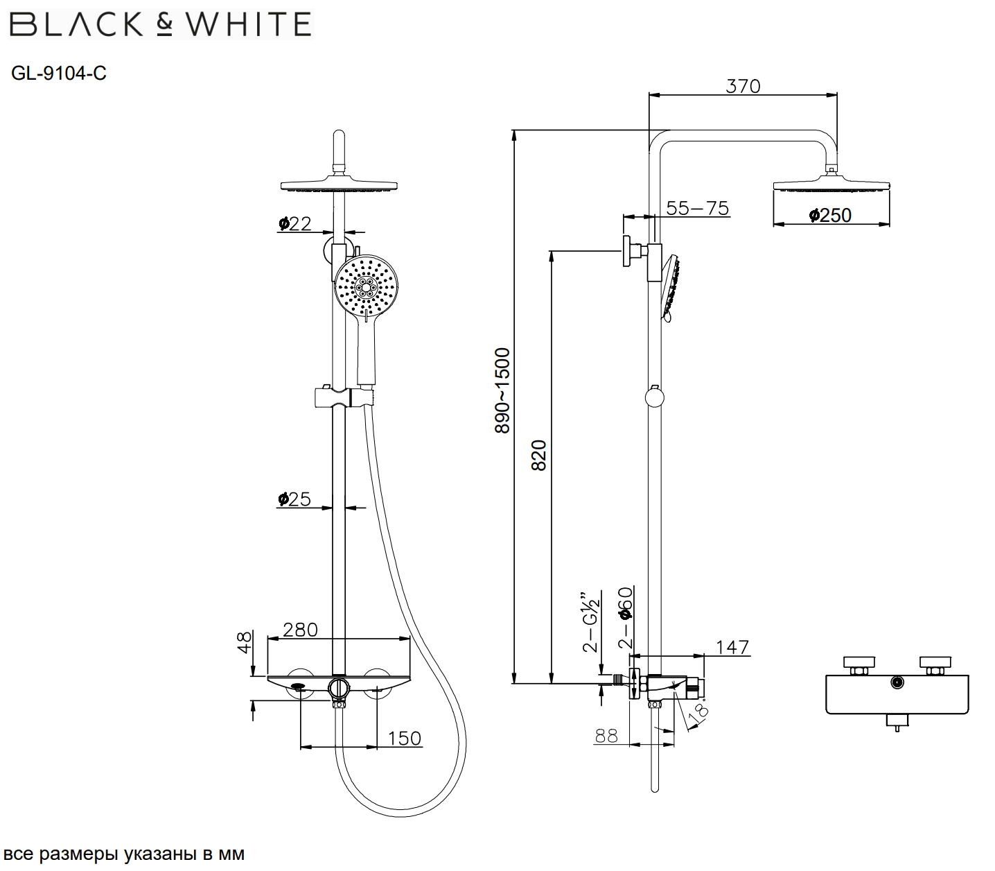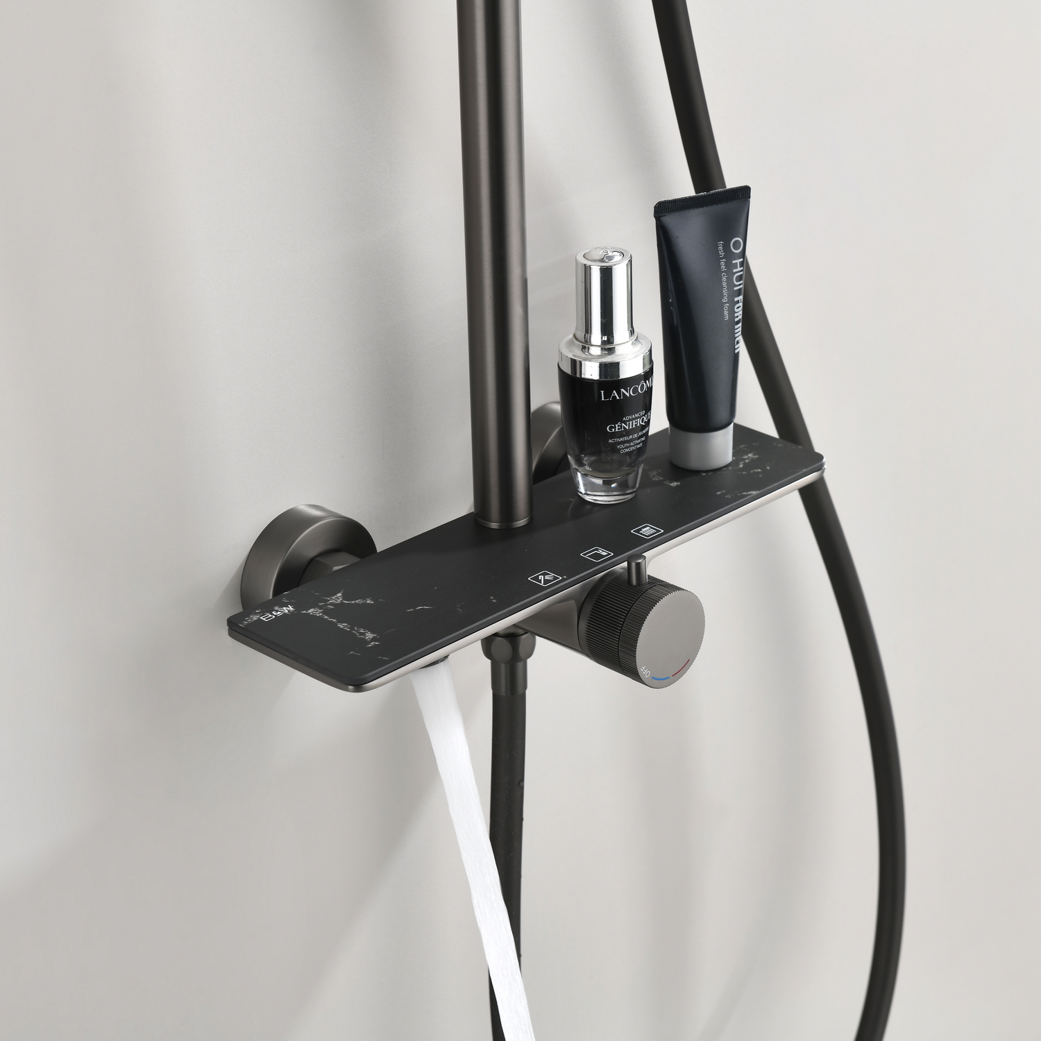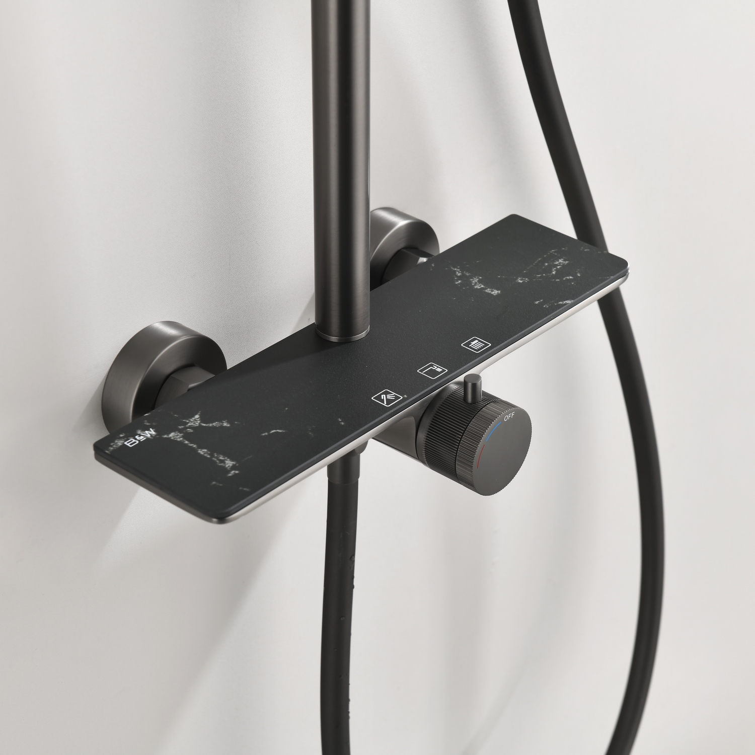 Душевая стойка Black&White – продуманный и яркий элемент для Вашей новой душевой зоны в ванной комнате. Корпус штанги и смесителя производится из латуни марки HPB 59– безопасный для здоровья сплав, выдерживающий высокое давление воды. Для управления потоками и температурой установлен прогрессивный картридж без регулировки давления, для экономии воды, а также в данной серии переключатель режимов установлен сразу за картриджем в виде кольца c продольными насечками – нетривиальное решение, которое облегчает уборку. Верхняя крышка смесителя стилизована под серый мрамор с прожилками. Из потребителей установлен верхний и ручной душ, а также излив для наполнения емкостей.