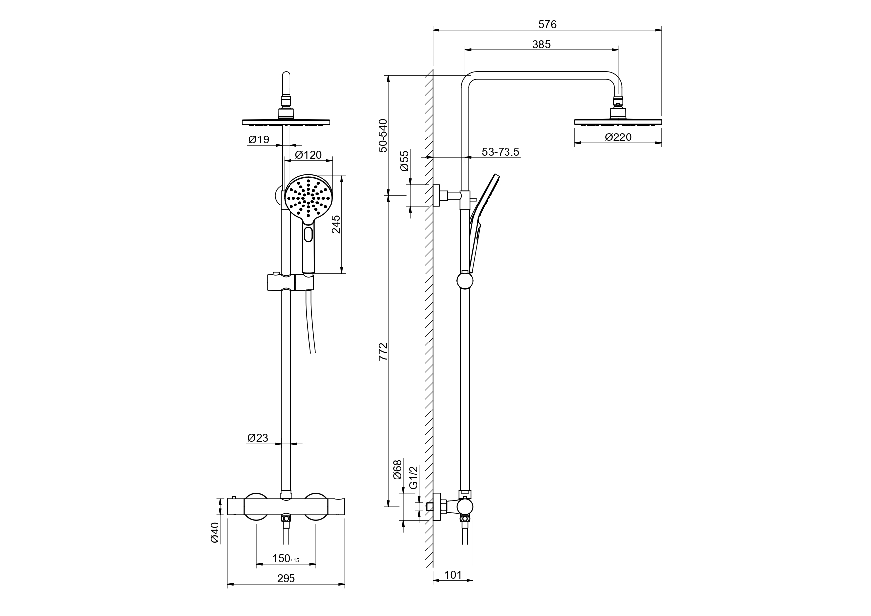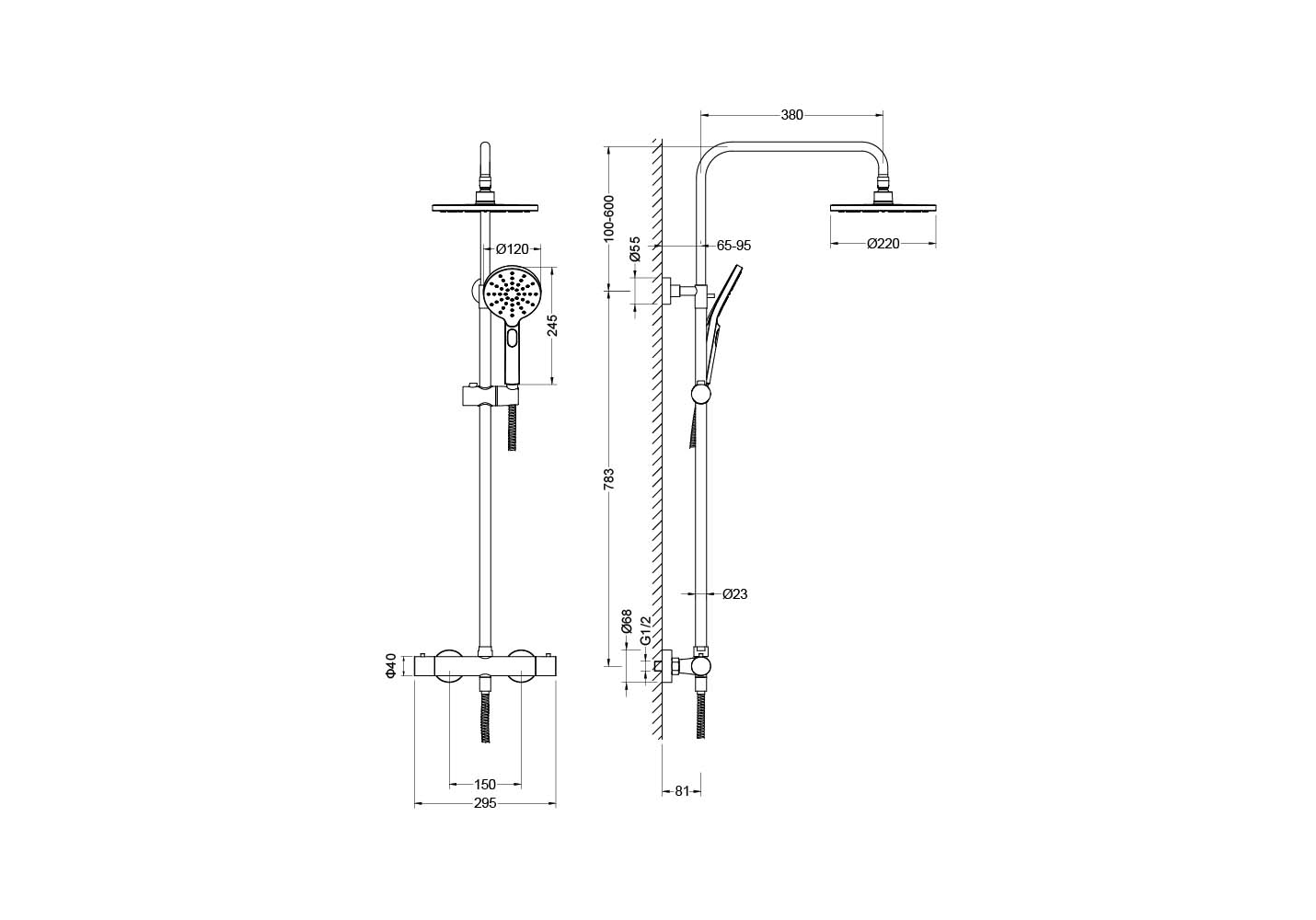 • регулируемая душевая штанга из нержавеющей стали, выдвигающаяся до 1383 мм в высоту