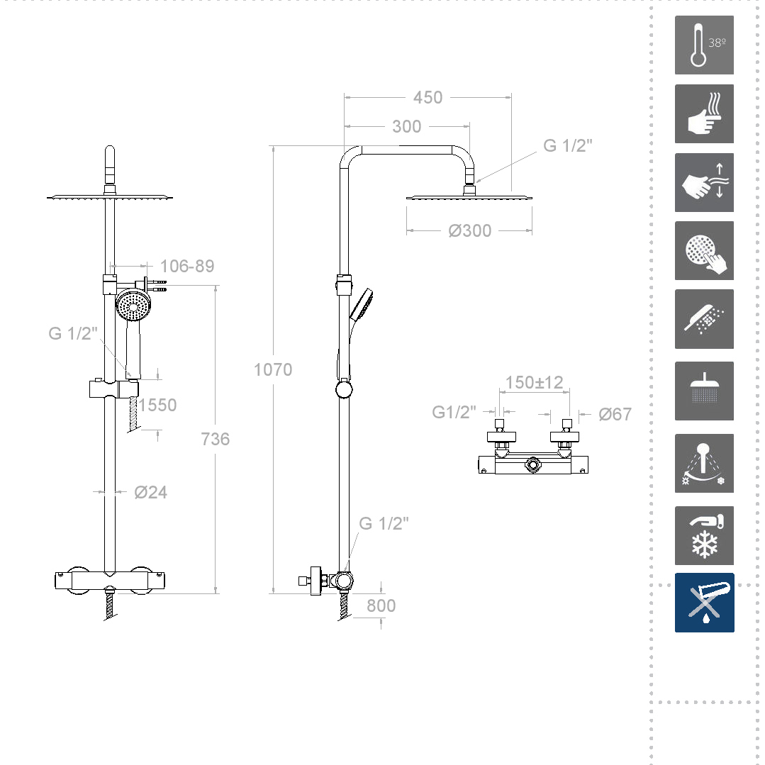 * Термостатический картридж с системой горячего блока для защиты от ожогов и системой термостата для блокировки температуры при 38°.