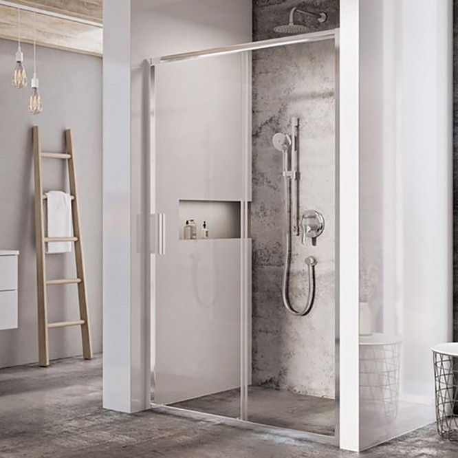 Изделие состоит из одной неподвижной части и одной подвижной - раздвижной двери. Устанавливается в облицованную кафелем нишу на поддоны RAVAK Perseus, Perseus Pro, Perseus Pro Flat, Perseus Pro Chrome, Gigant, Gigant Pro, Gigant Pro Flat, Gigant Pro Chrome или непосредственно на пол со встроенным душевым каналом.