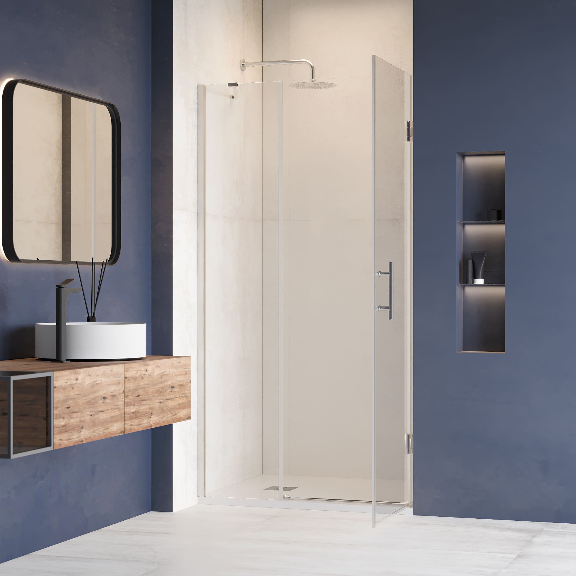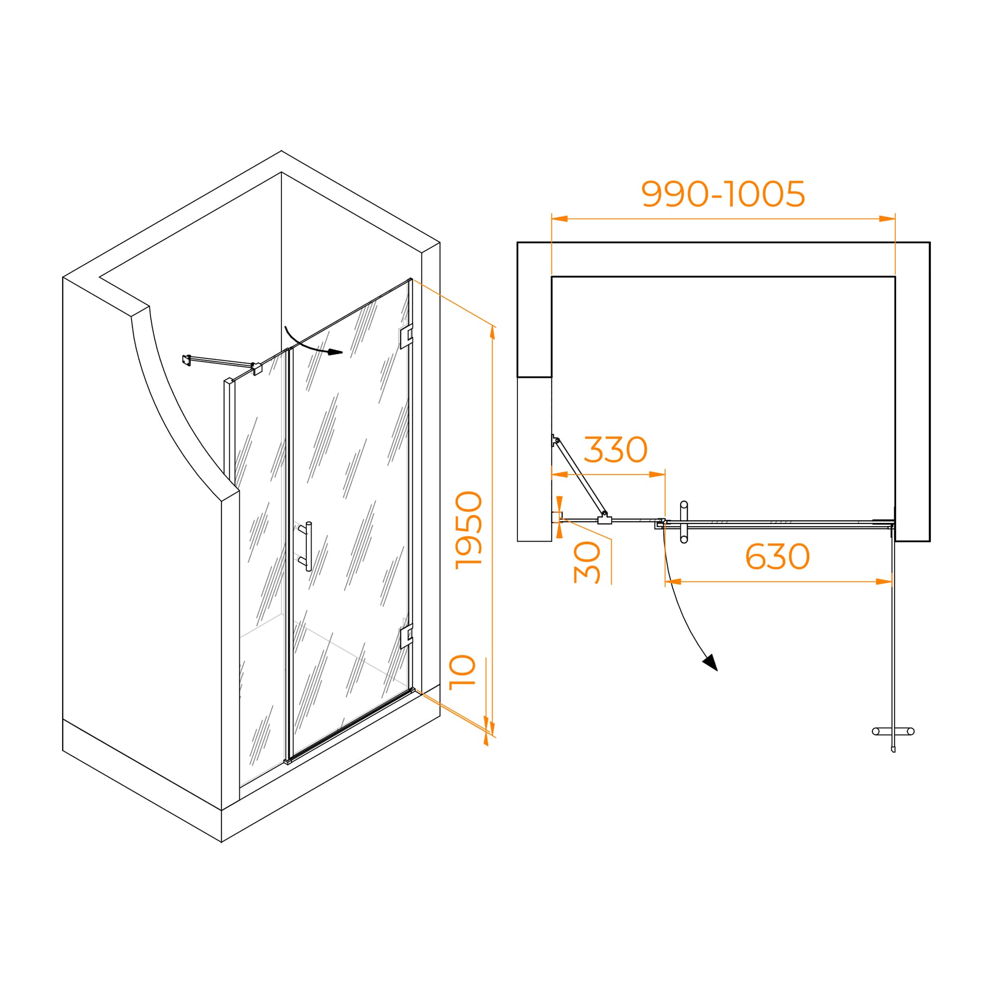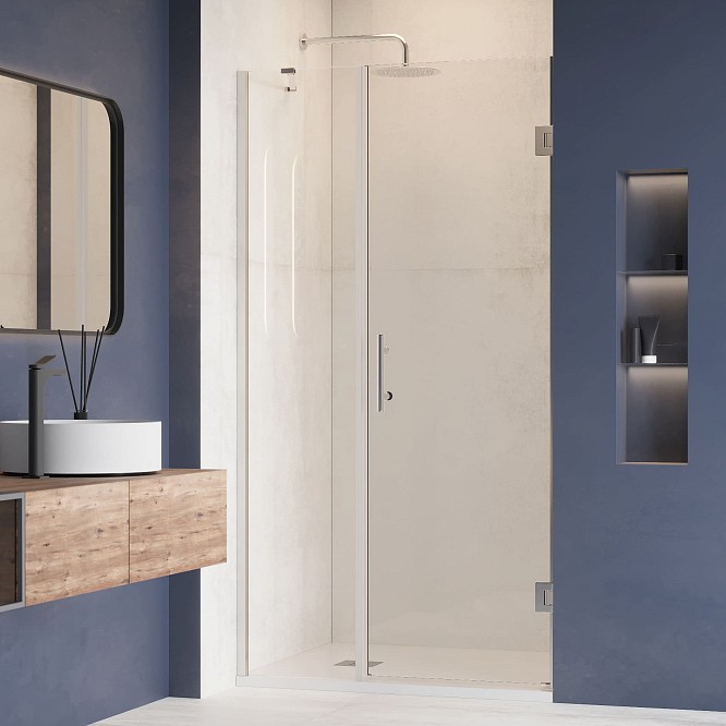 Хромированный цвет профиля этой душевой двери придает нотку современности и дополняет любой интерьер ванной комнаты. Водонепроницаемые стальные петли обеспечивают долговечность и надежность, предотвращая утечку воды и обеспечивая сухую и комфортную среду в ванной комнате.