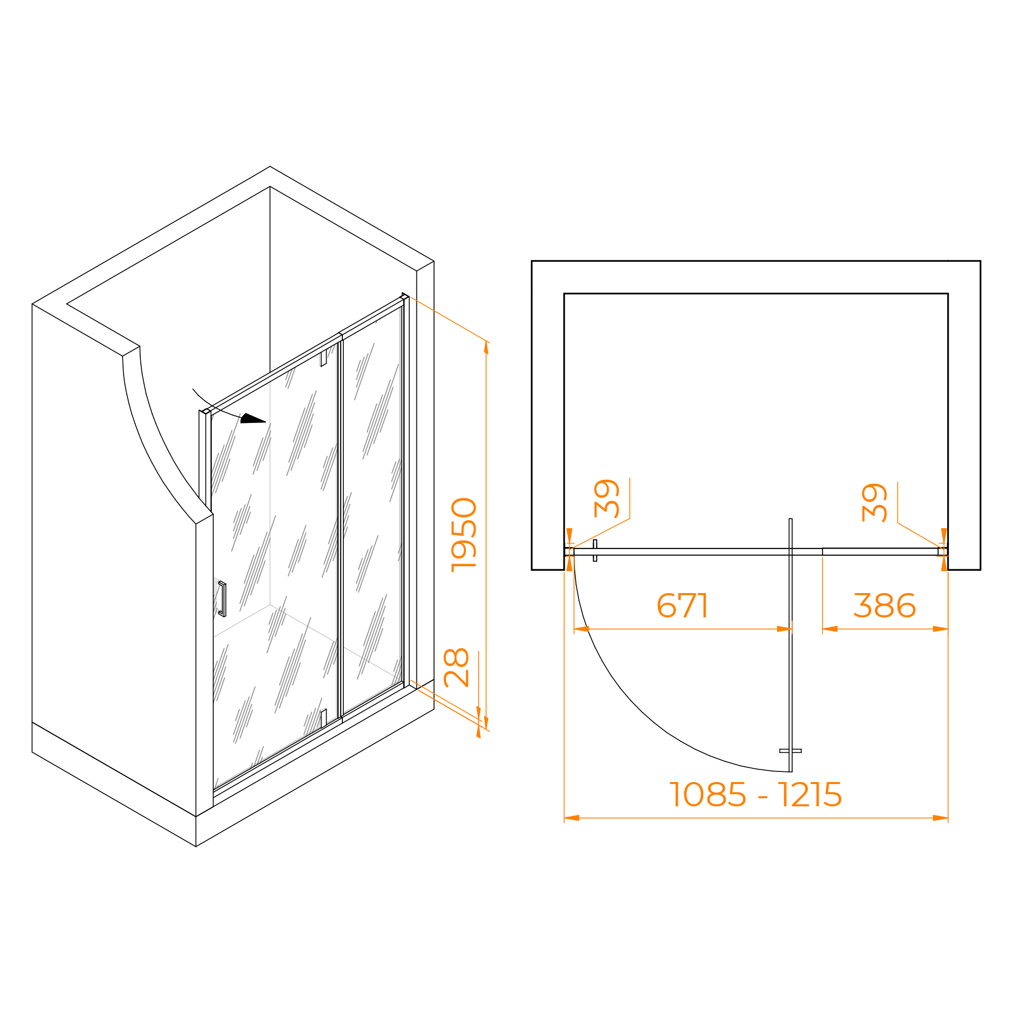 | Конструкция | Распашная, ширина входа 67,1 см, стационарное стекло 38,6 см |