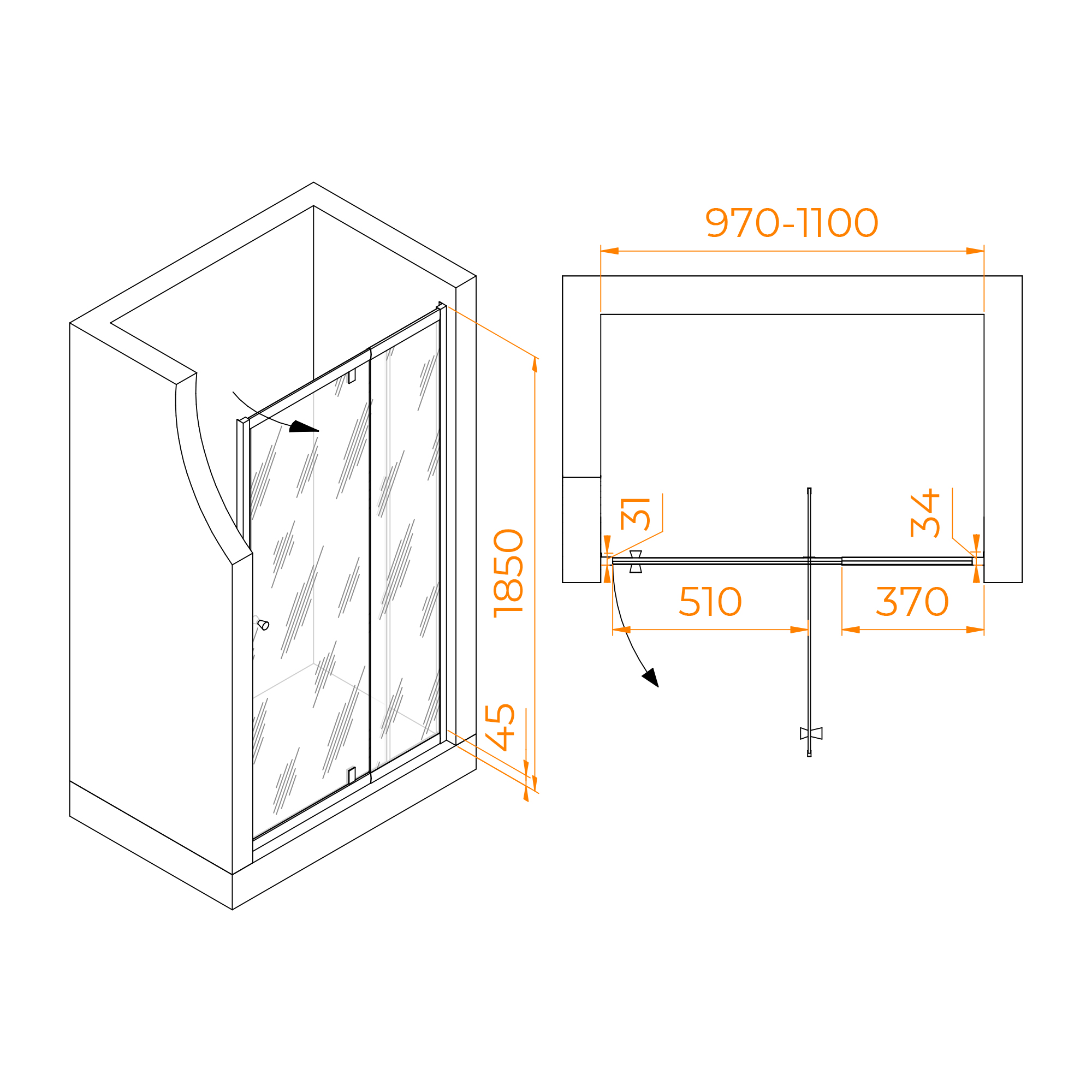 Водонепроницаемые стальные петли обеспечивают прочное крепление двери и высокую надежность, что делает эту душевую дверь идеальным выбором для каждого дома. Общая высота конструкции - 1850 мм.