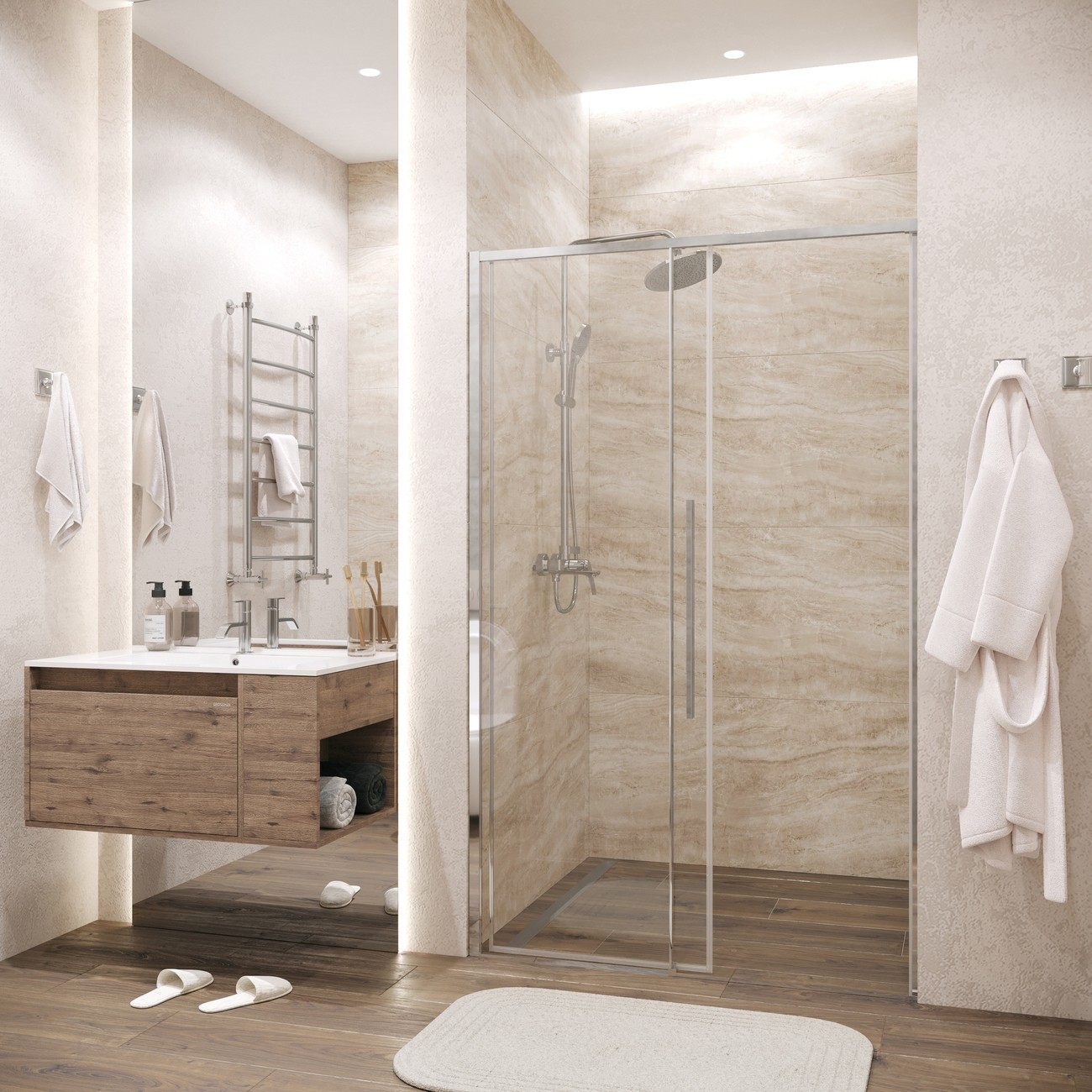 | Особенности | При комплектации боковой стенкой формирует душевой уголок |
