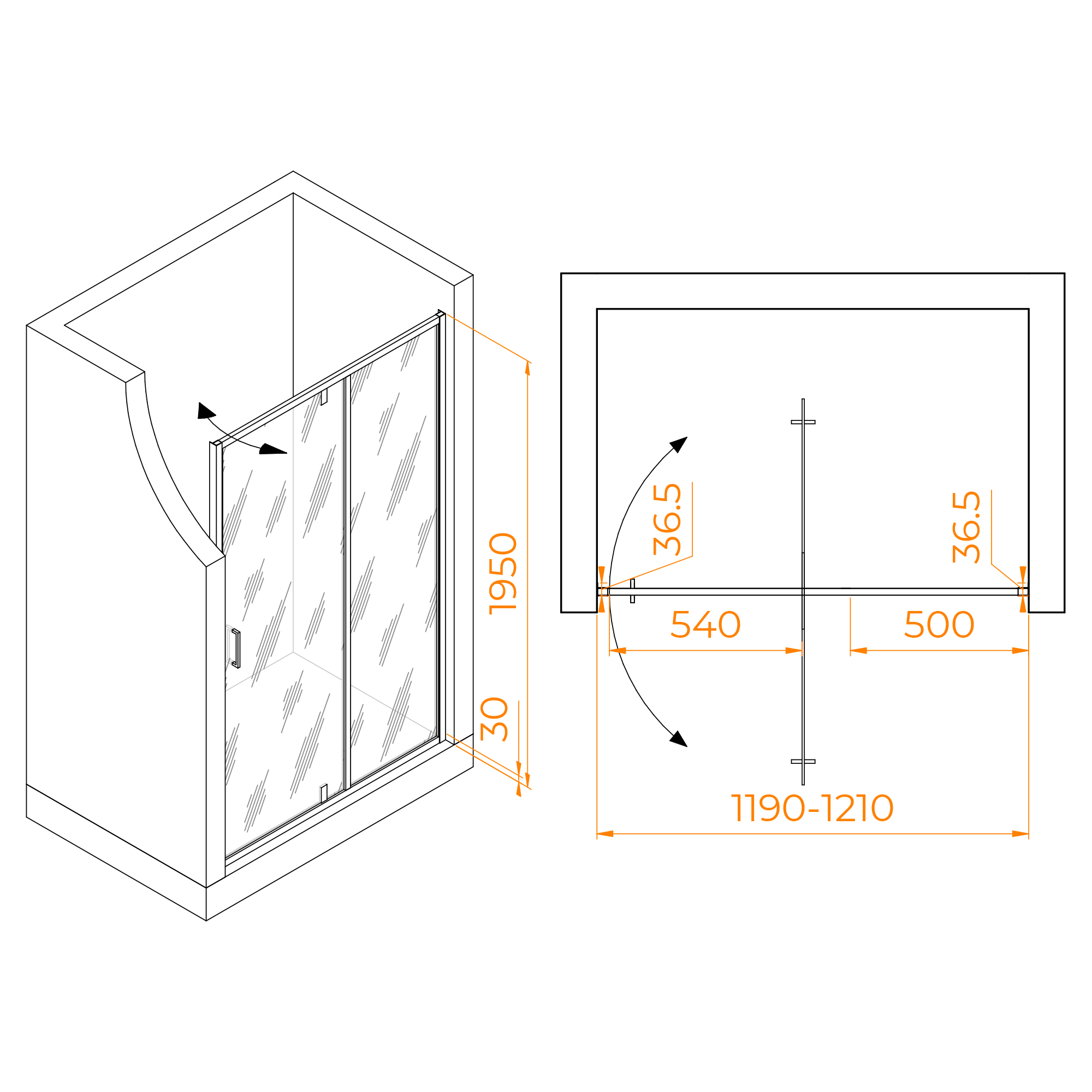 | Конструкция | Распашная (1), ширина входа 54 см + стационарное стекло |
