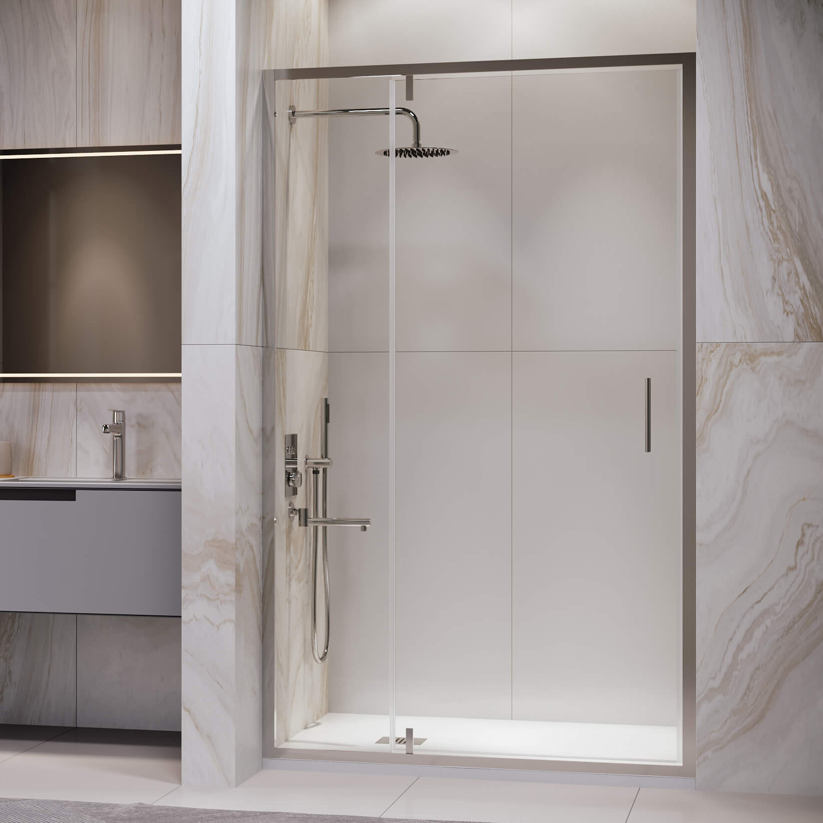 Конструкция распашных маятниковых дверей позволяет высвобождать пространство, не занимая лишнего места в ванной комнате, так как они могут открываться как внутрь, так и наружу. Стекло с покрытием анти капля Easy Clean минимизирует образование водяных капель и облегчает уход за дверью.