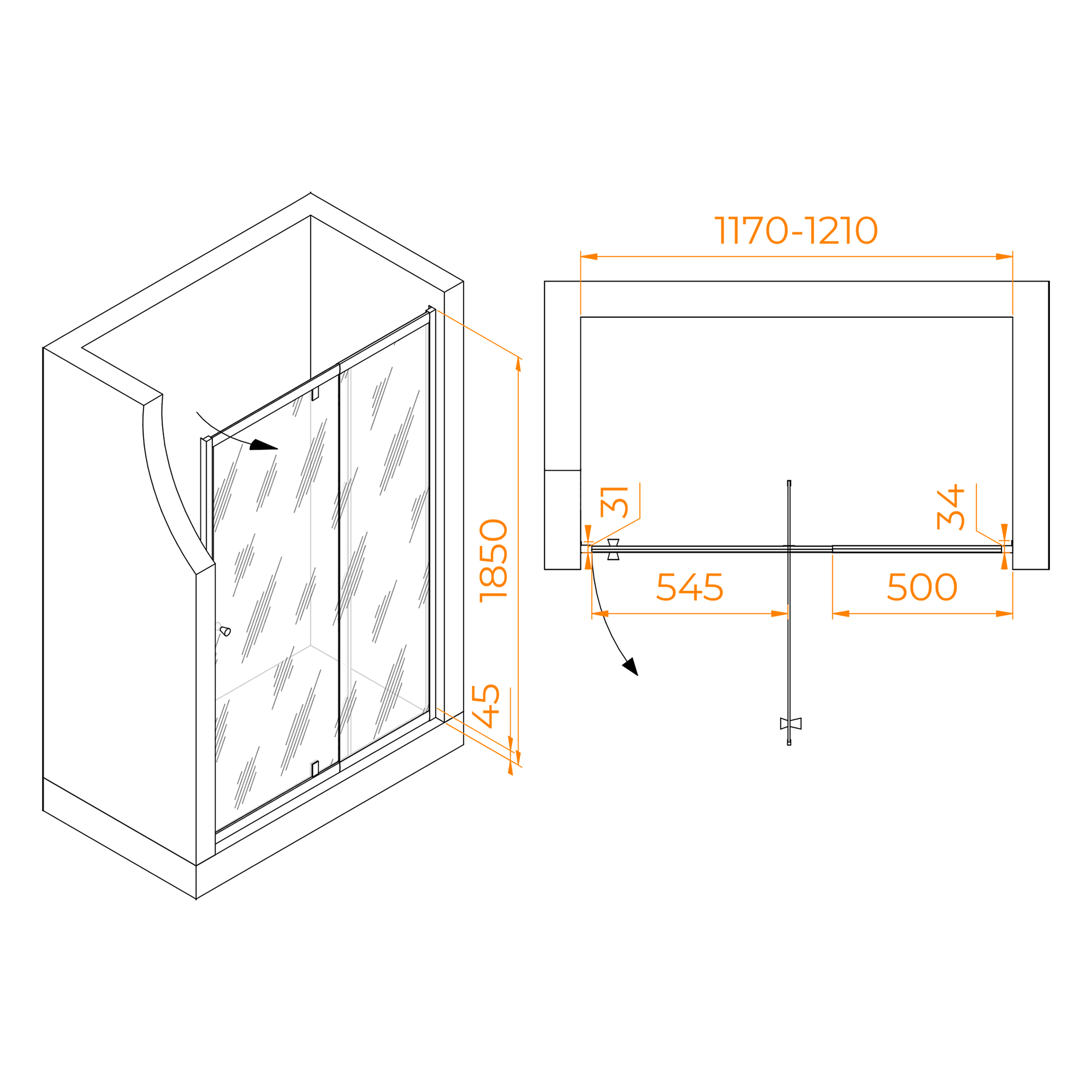 Водонепроницаемые стальные петли обеспечивают прочное крепление двери и высокую надежность, что делает эту душевую дверь идеальным выбором для каждого дома. Общая высота конструкции - 1850 мм.