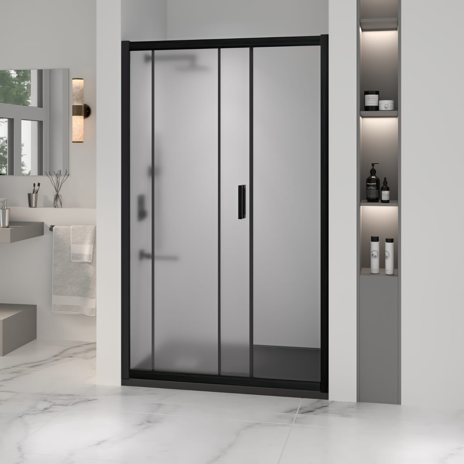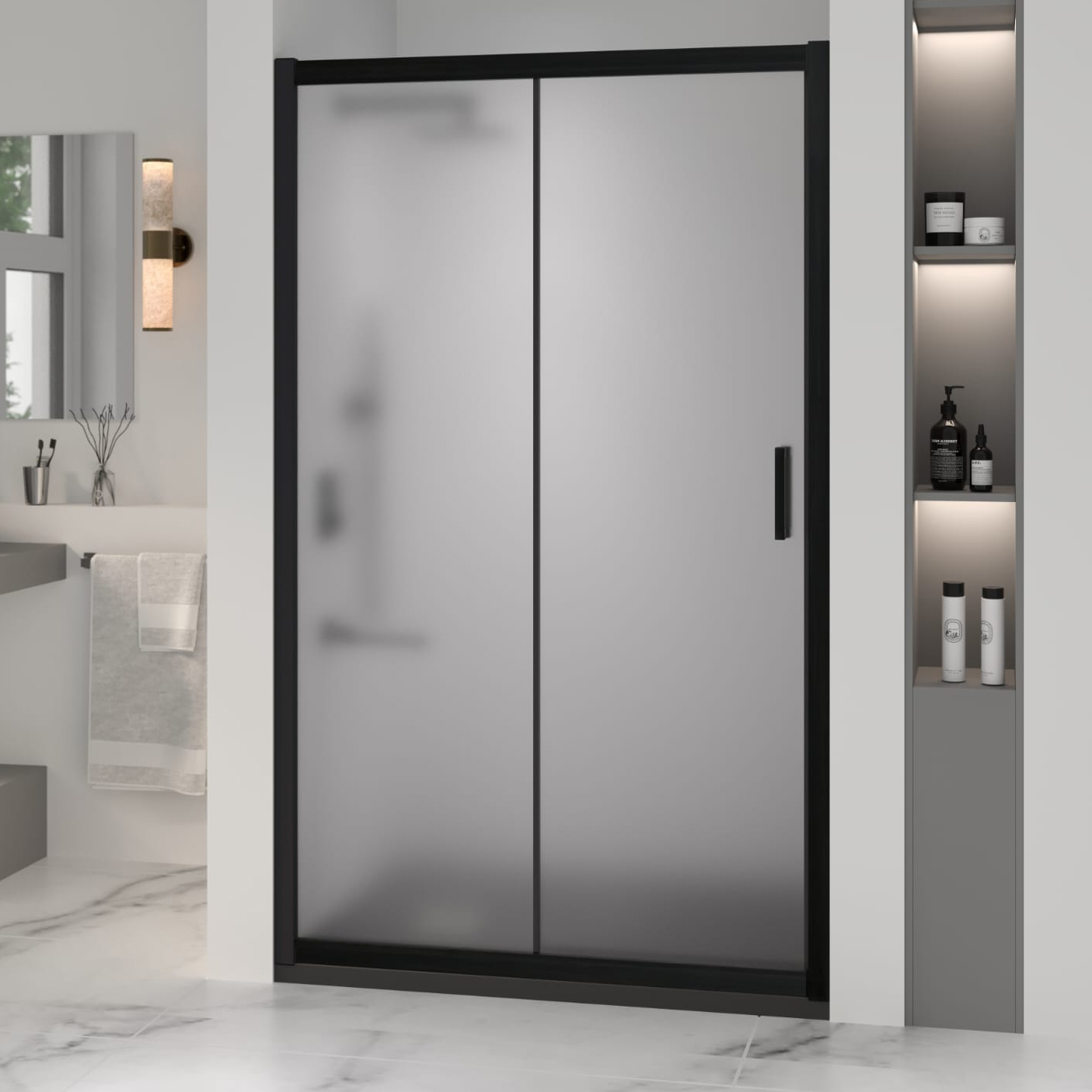 Профиль двери выполнен из анодированного алюминия черного цвета, что придает ей элегантный и современный вид. Высота общая двери составляет 1950 миллиметров. Конструкция дверей раздвижная, что позволяет сэкономить место в ванной комнате.