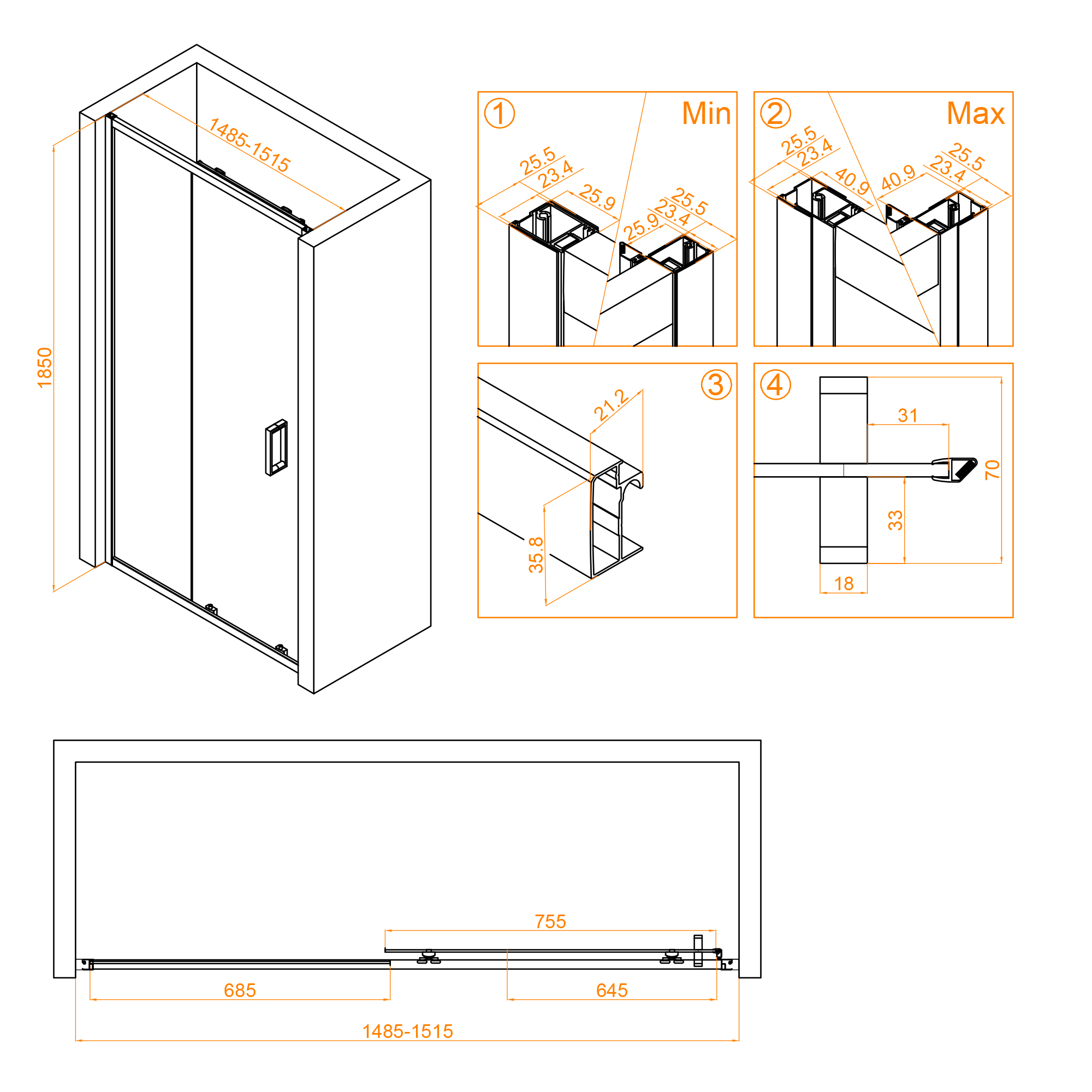 Дверь имеет общую высоту 1850 мм, что подходит для большинства стандартных ванных комнат. Двойные регулируемые ролики обеспечивают плавное и бесшумное открытие и закрытие двери. Благодаря роликовому подшипнику дверь двигается легко и плавно.