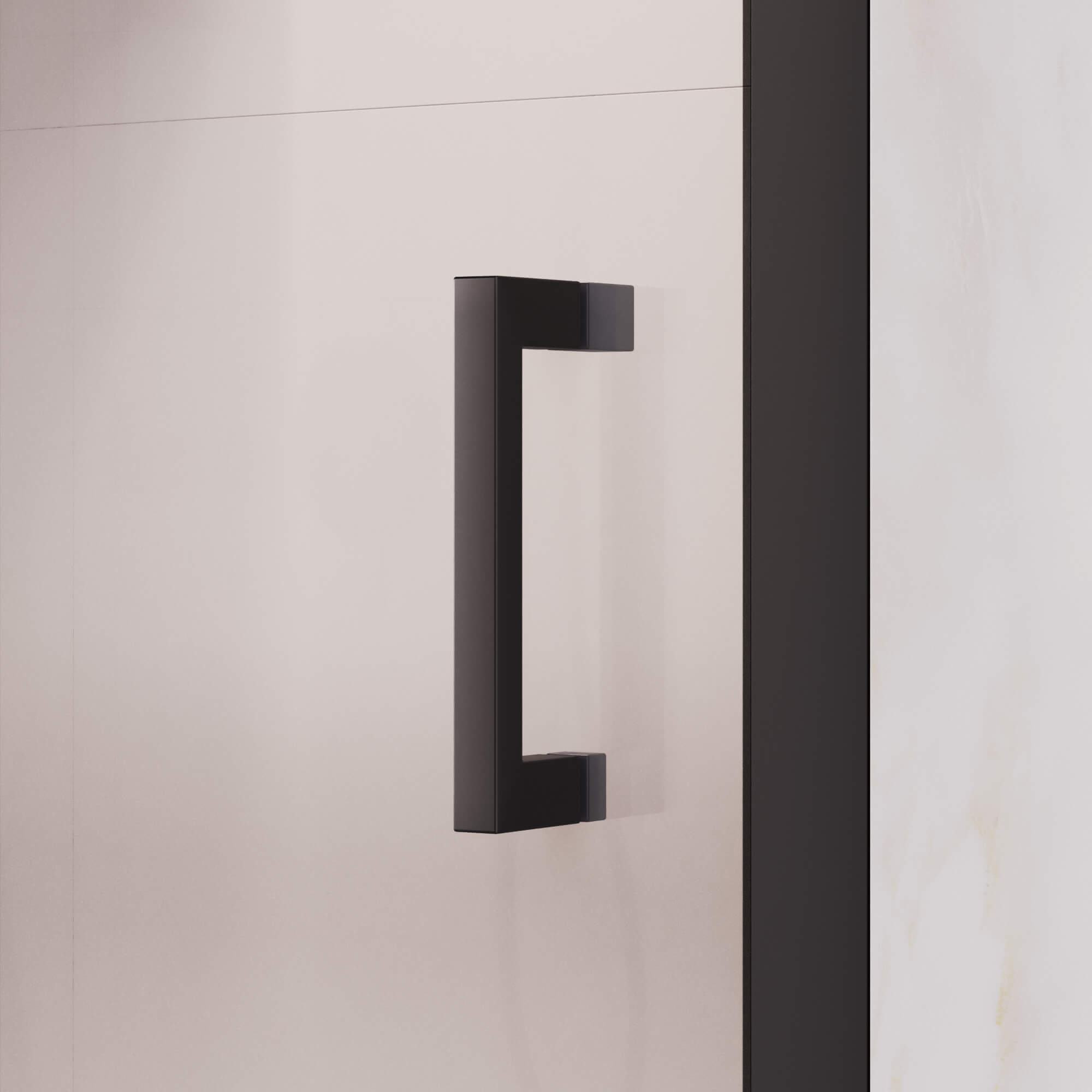 Прозрачное стекло добавляет простоты и элегантности, а черный цвет профиля подчеркивает стиль и современность двери. Общая высота составляет 1950 миллиметров, что позволяет установить дверь в большинство ванных комнат.