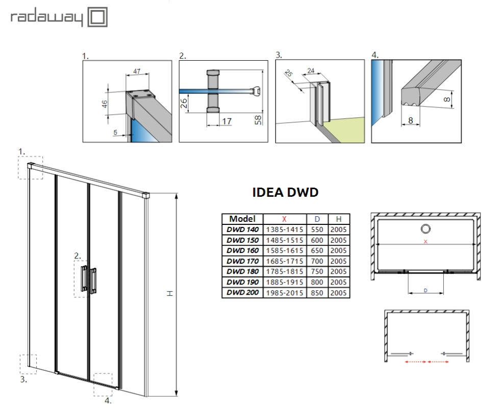 Коллекция Idea - это первая коллекция в стиле настоящего минимализма — двойные ролики спрятаны внутри профилей, на пристенных профилях отсутствуют даже заглушки болтов — в место них маскировочная лента Nastro Chromo. Все изделия серии допускается устанавливать как на поддон так и непосредственно на пол. Кроме того, все изделия допускается устанавливать с порогом или без порога меняя нижний фиксатор (в комплекте).
